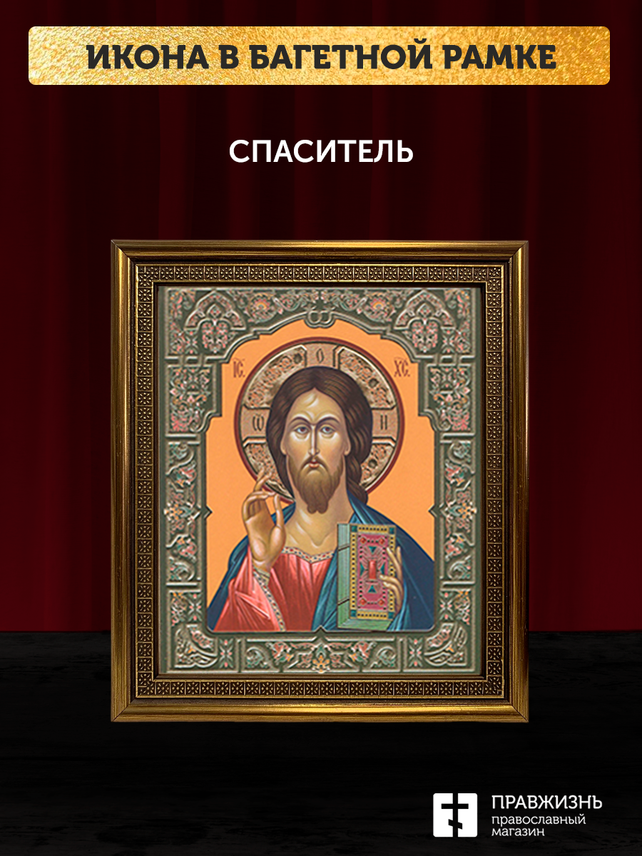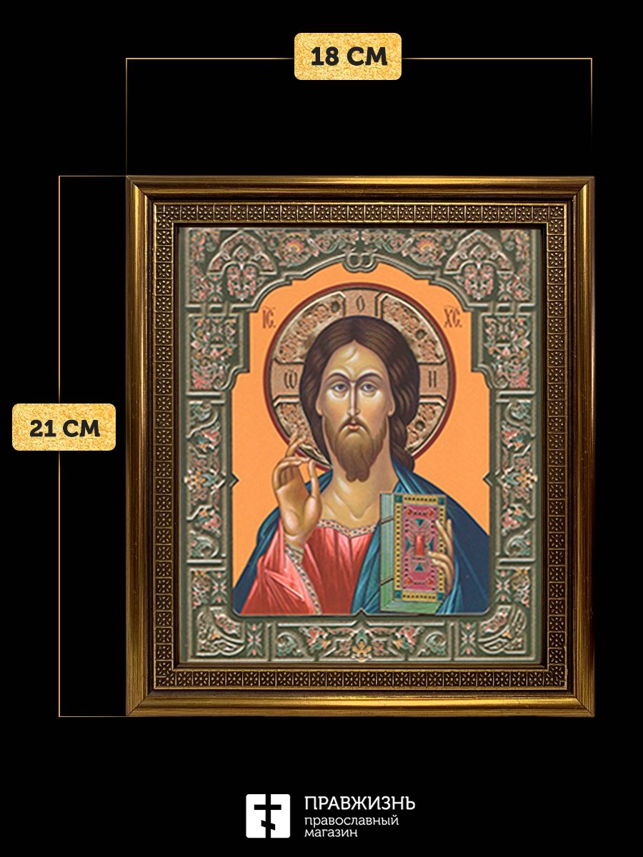 Икона Спаситель, бронзовая багетная рамка узкая с узором 15х18 см