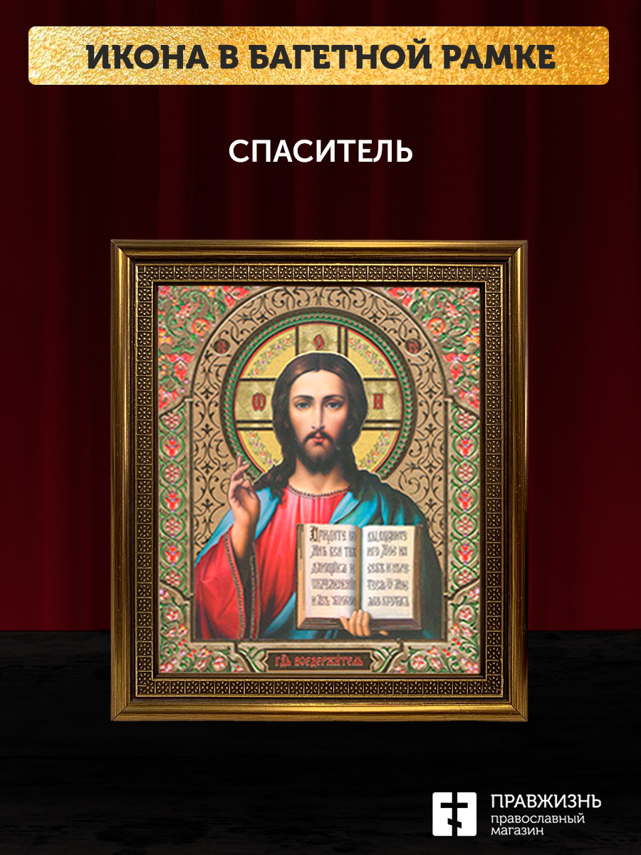 Икона Спаситель, бронзовая багетная рамка узкая с узором 15х18 см