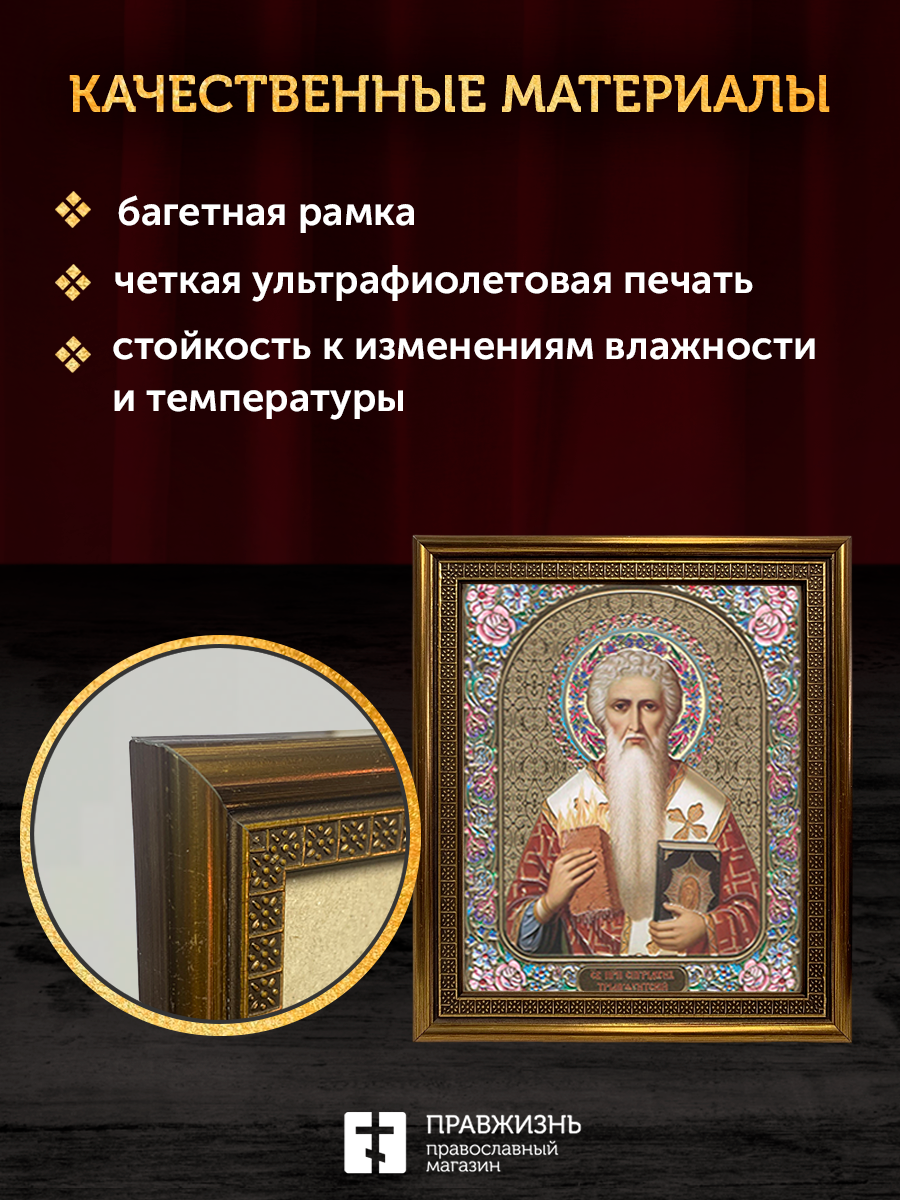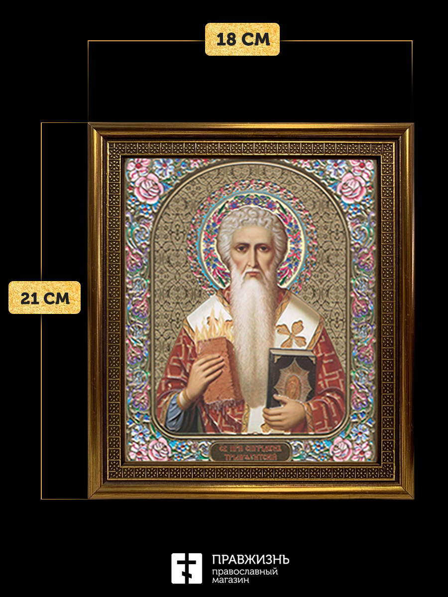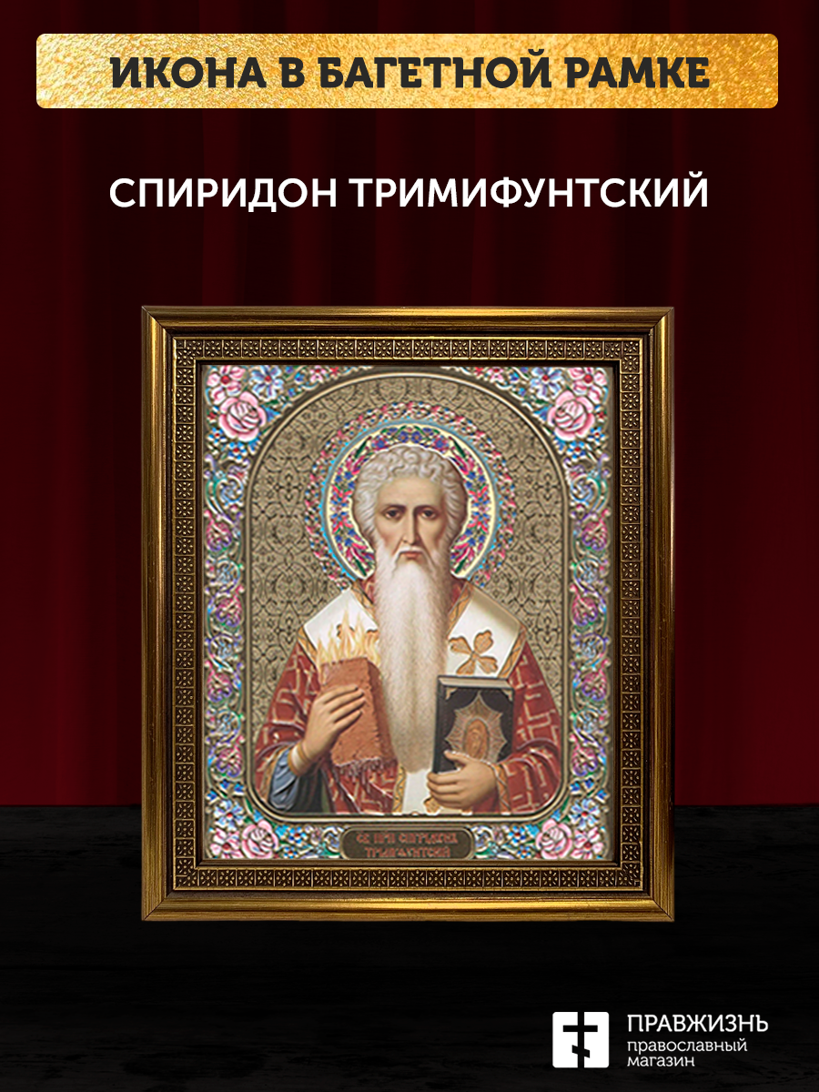 Икона Спиридон Тримифунтский, бронзовая багетная рамка узкая с узором 15х18 см