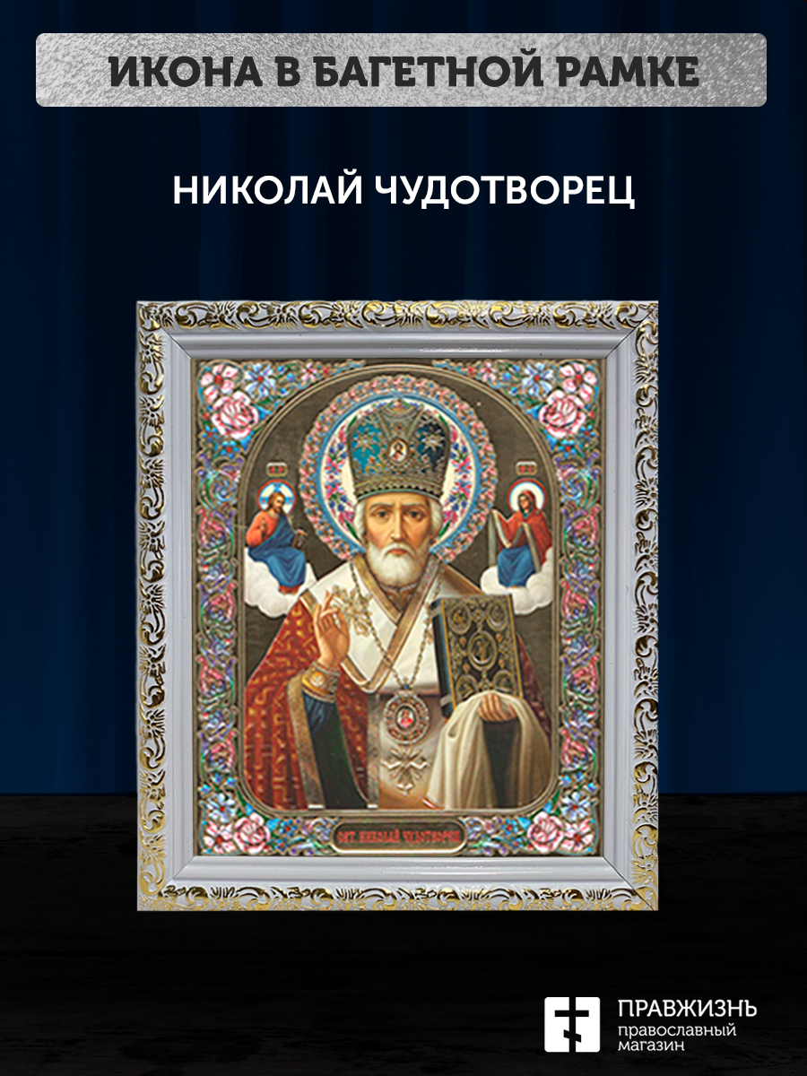 Икона Николай Чудотворец, бронзовая багетная рамка узкая с узором 15х18 см
