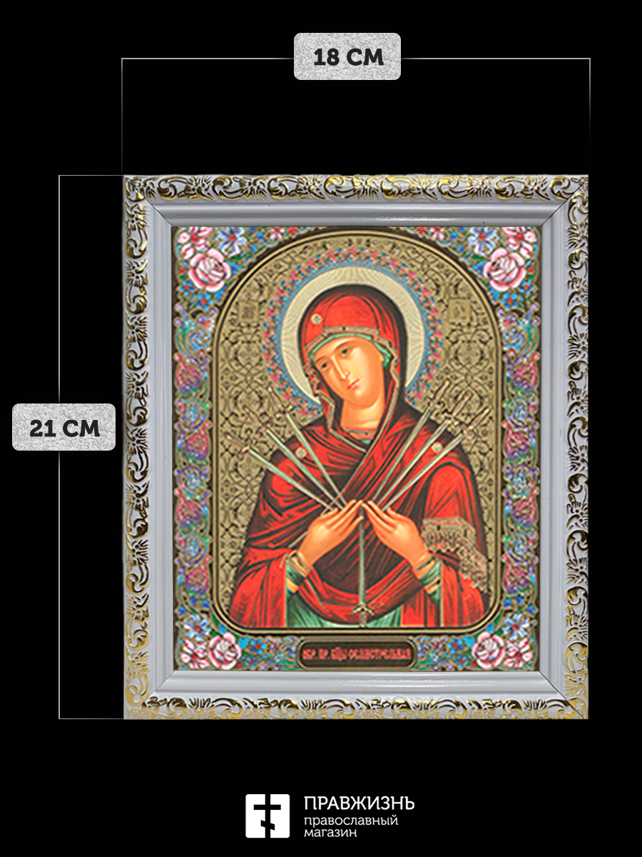 Икона Семистрельная Божия Матерь, бронзовая багетная рамка узкая с узором 15х18 см