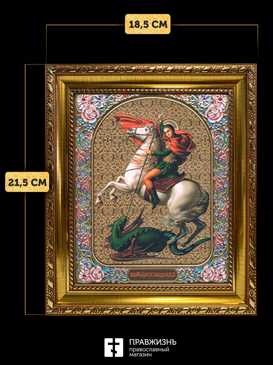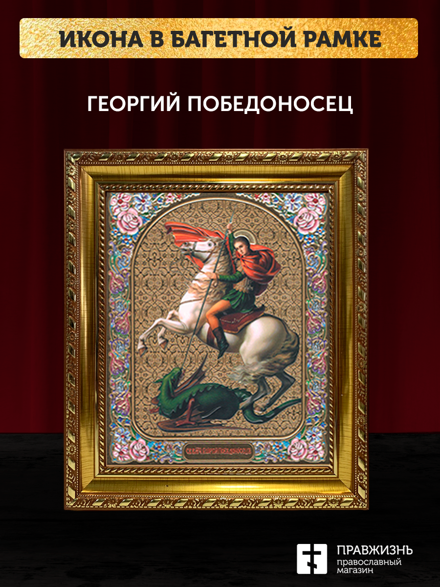Икона Георгий Победоносец, бронзовая багетная рамка узкая с узором 15х18 см