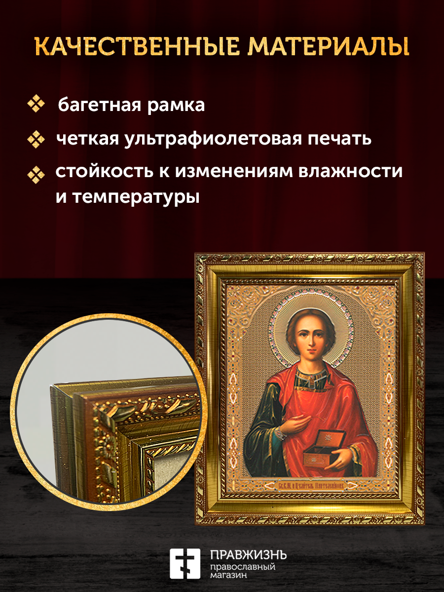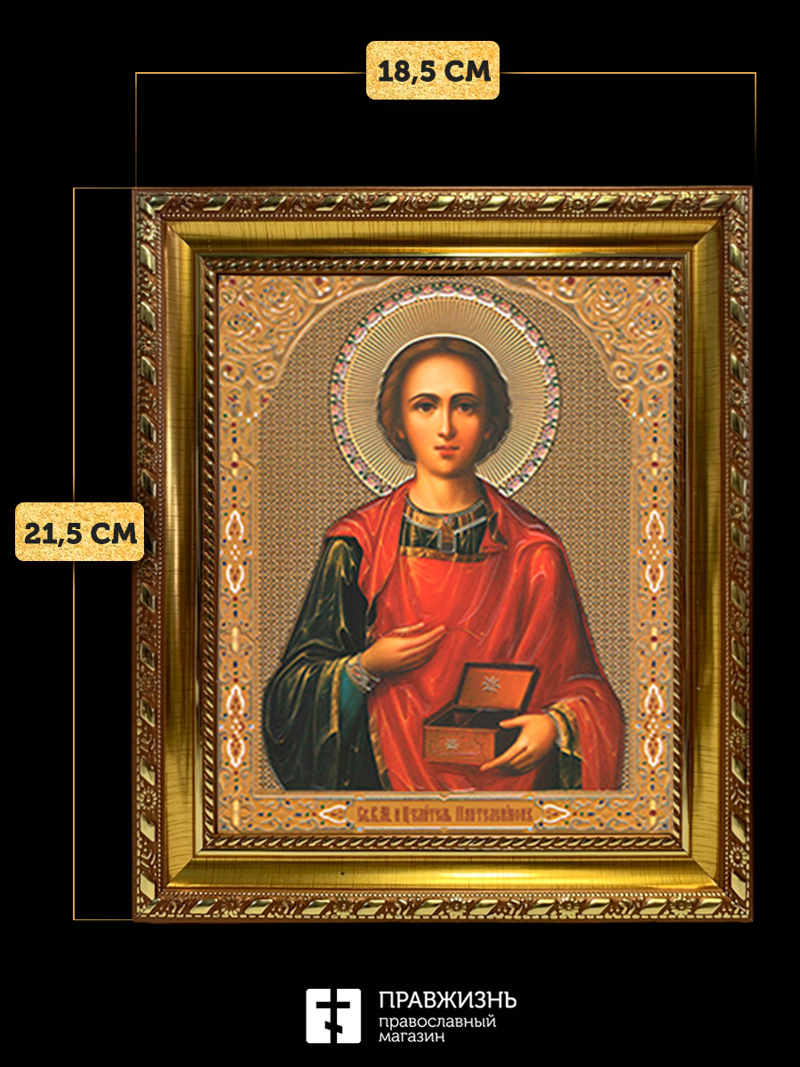 Икона Пантелеймон Целитель, бронзовая багетная рамка узкая с узором 15х18 см
