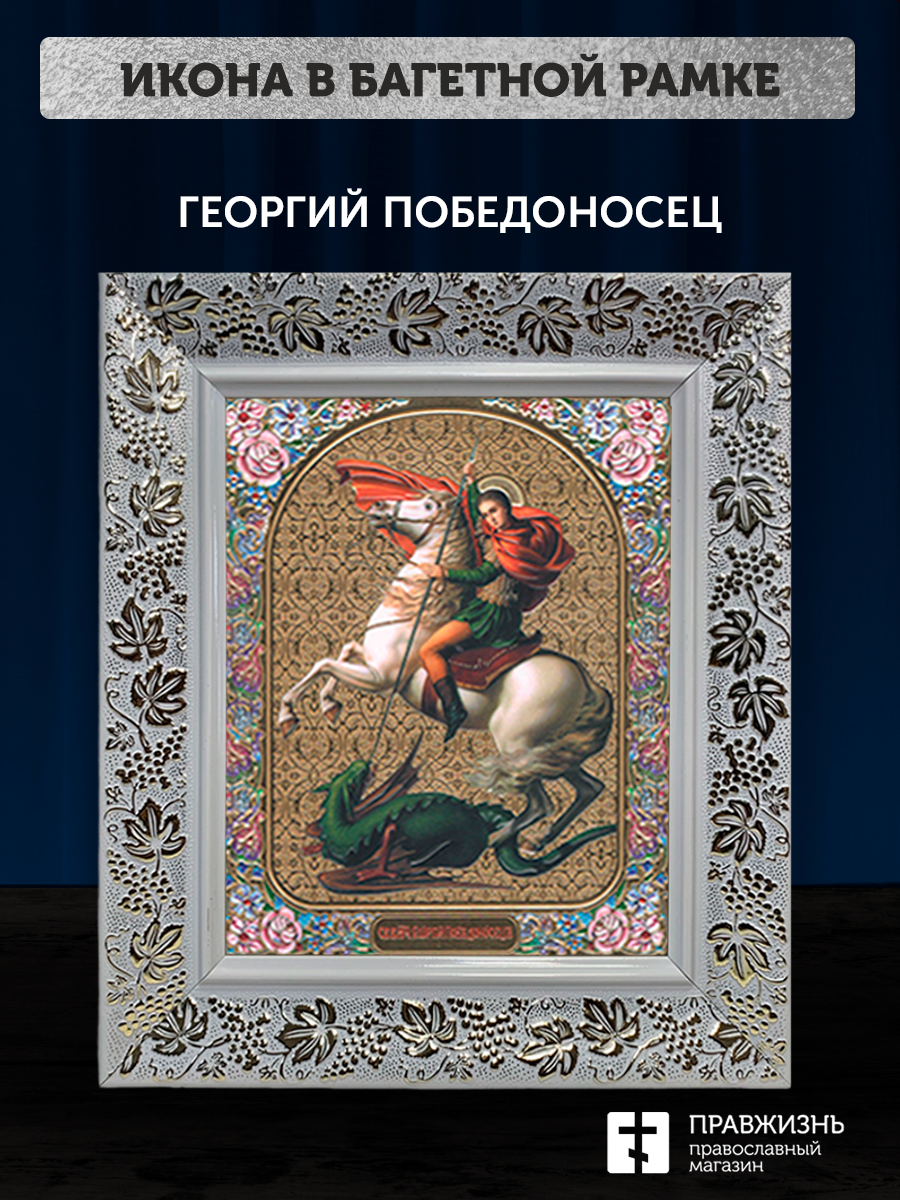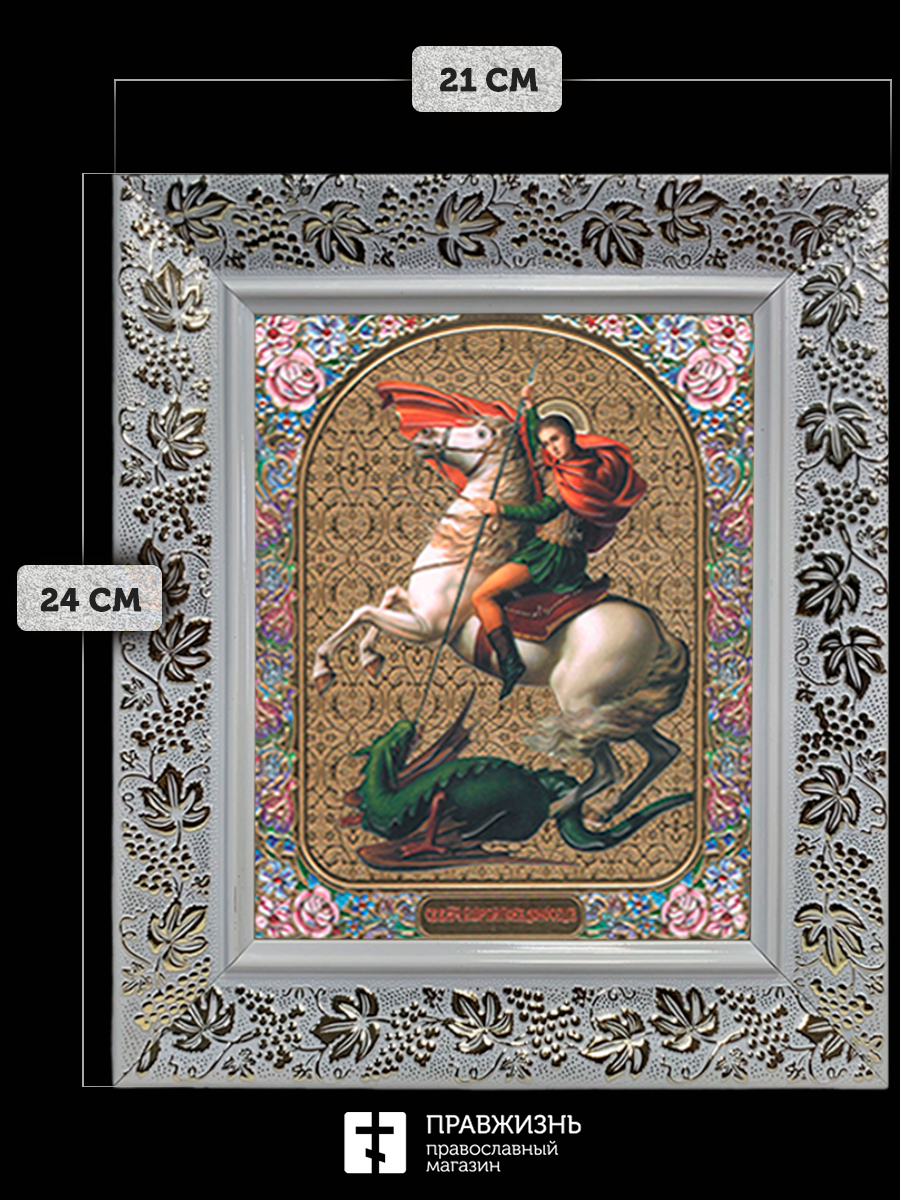 Икона Георгий Победоносец, бронзовая багетная рамка узкая с узором 15х18 см