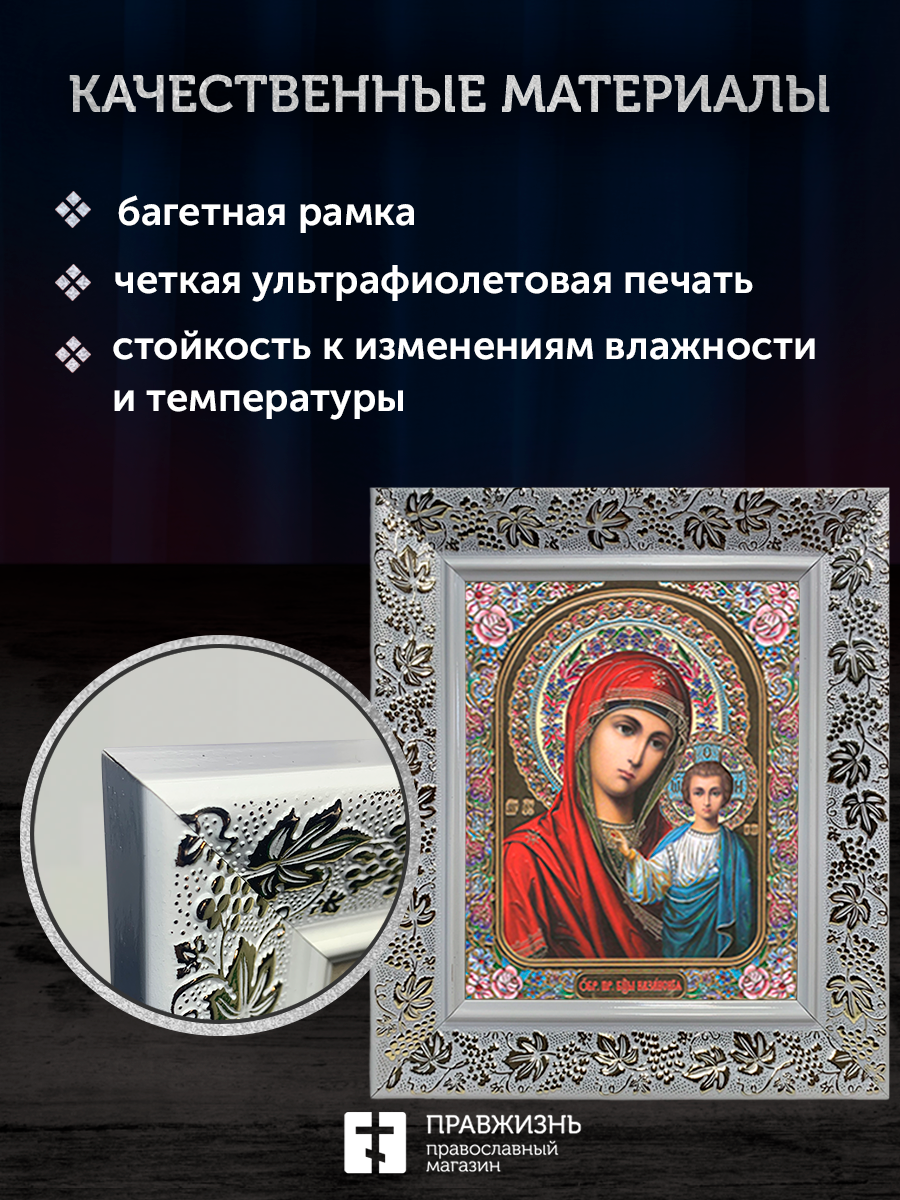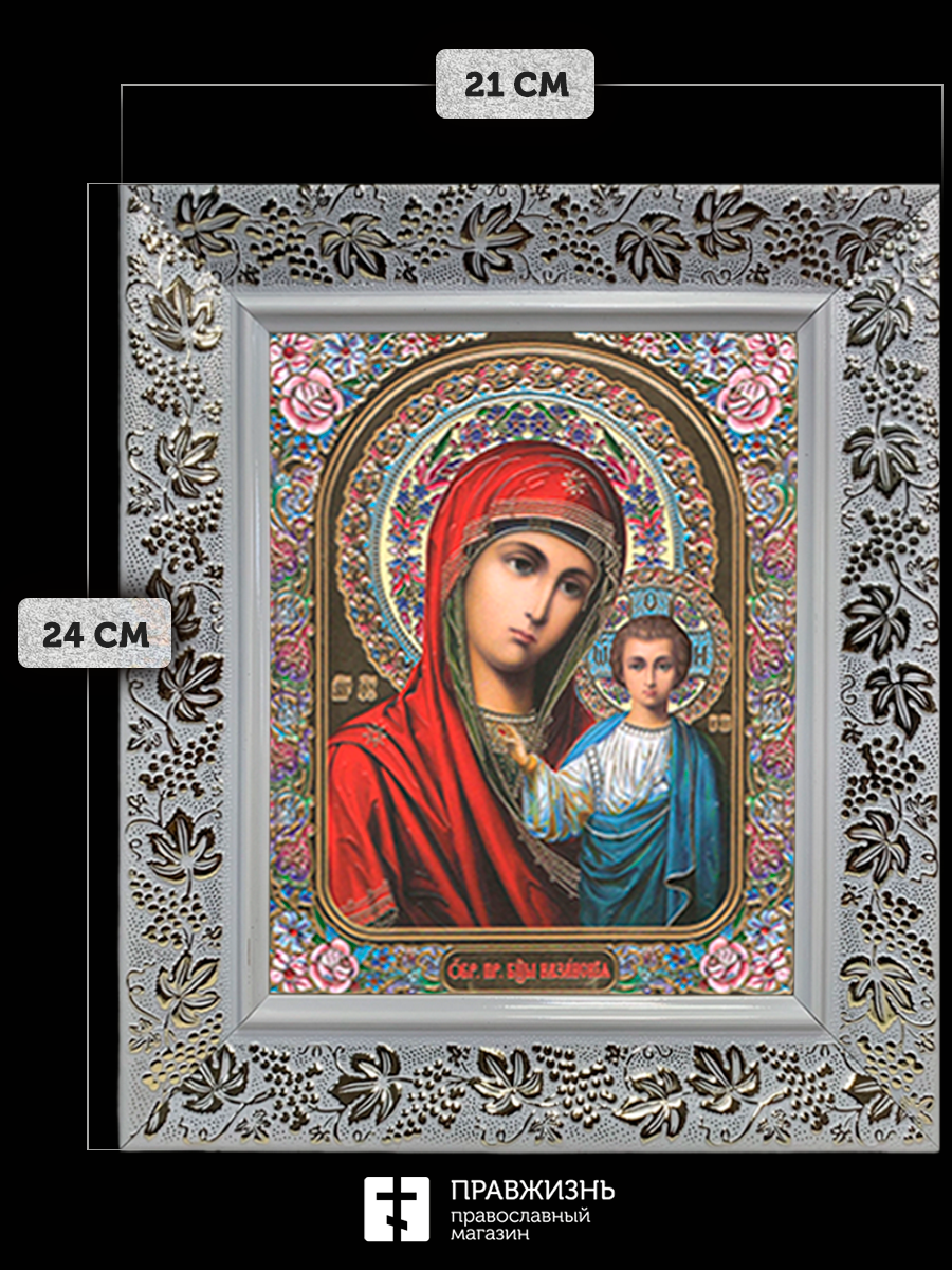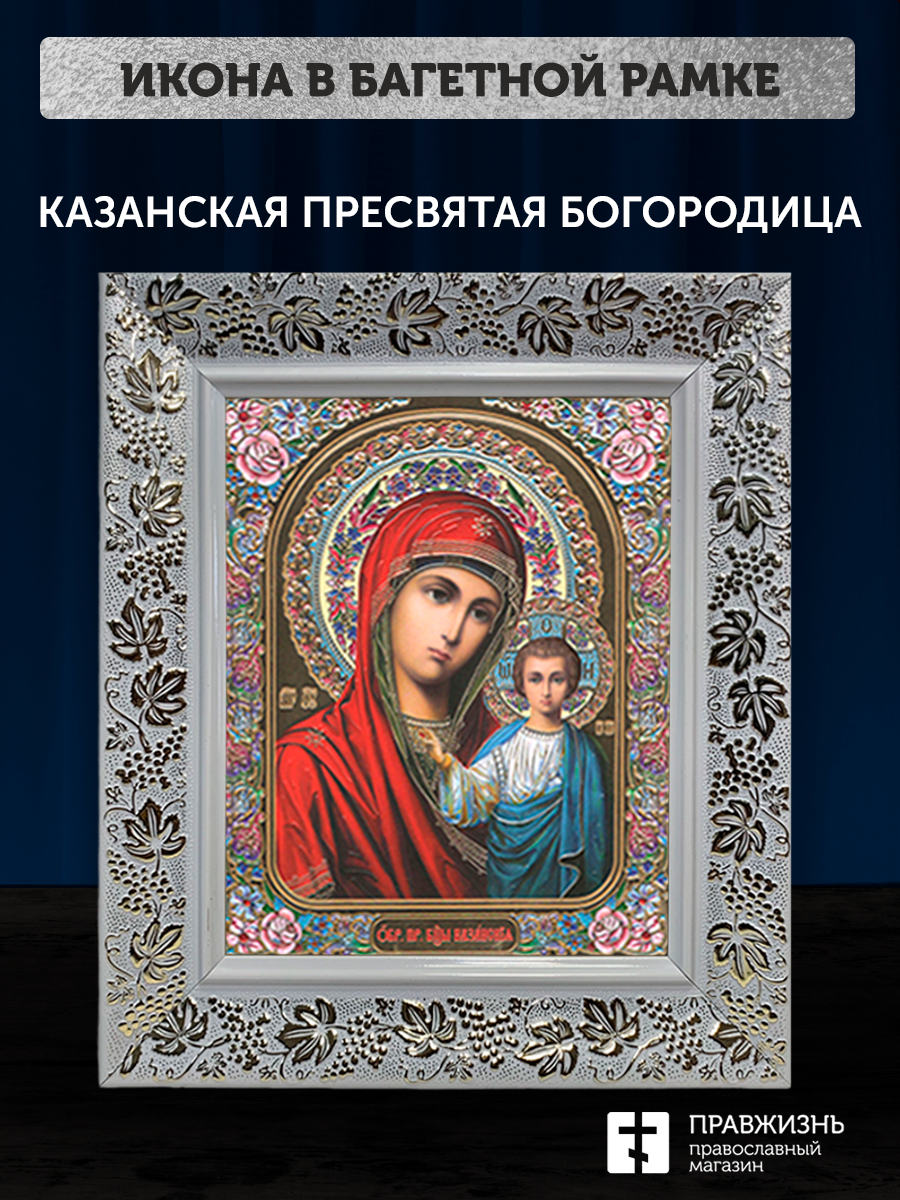 Икона Казанская Божия Матерь, бронзовая багетная рамка узкая с узором 15х18 см