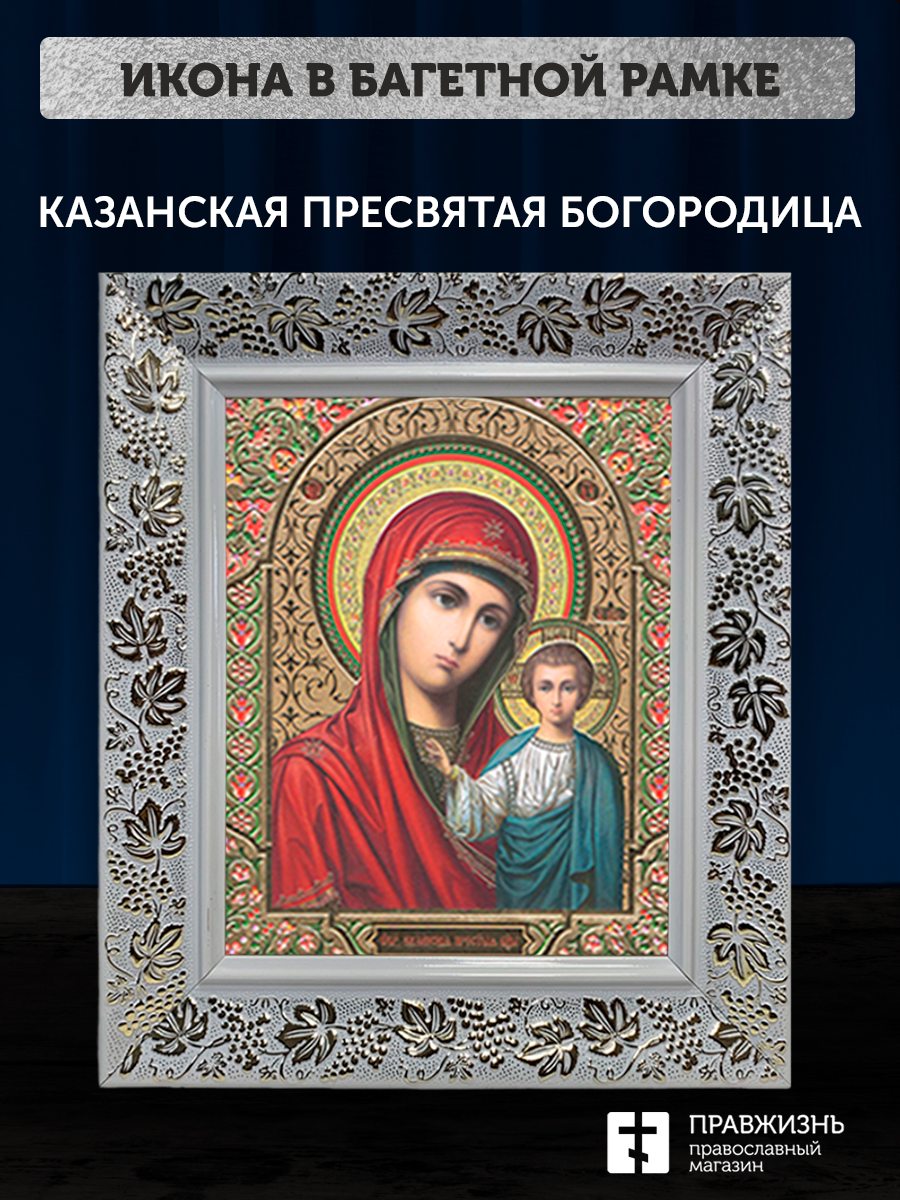 Икона Казанская Божия Матерь, бронзовая багетная рамка узкая с узором 15х18 см