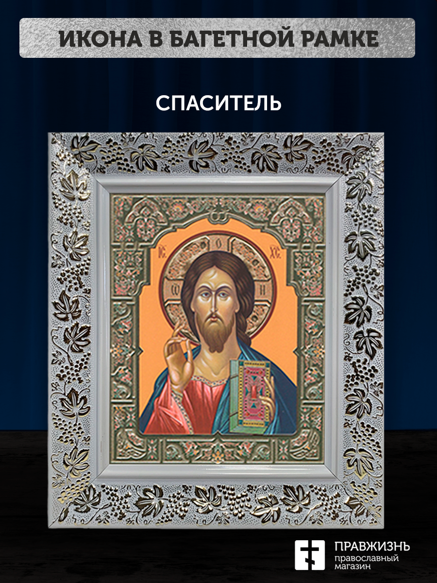 Икона Спаситель, бронзовая багетная рамка узкая с узором 15х18 см