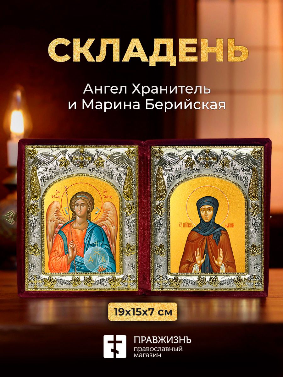 Икона Марина Берийская и Ангел Хранитель в ризах именной бархатный складень, 19х15х7см