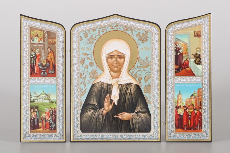 Складни деревянные 19х28 трёхстворчатые, двойное тиснение, фигурные, в упаковке Матрона Московская (с венчиком)
