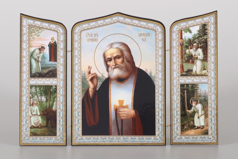 Складни деревянные 19х28 трёхстворчатые, двойное тиснение, фигурные, в упаковке Серафим Саровский