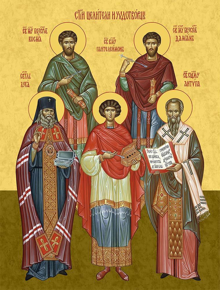 Икона собор Святых целителей и чудотворцев, деревянная рамка со стеклом 15х18х2 см 1133