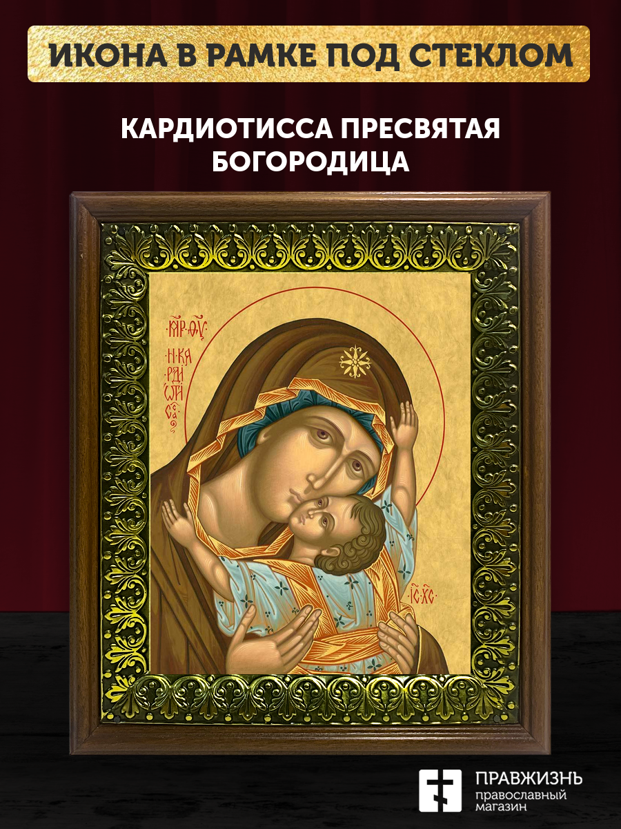 Икона Божией Матери Кардиотисса, деревянная рамка с басмой и стеклом 18х21х2,5 см 1219