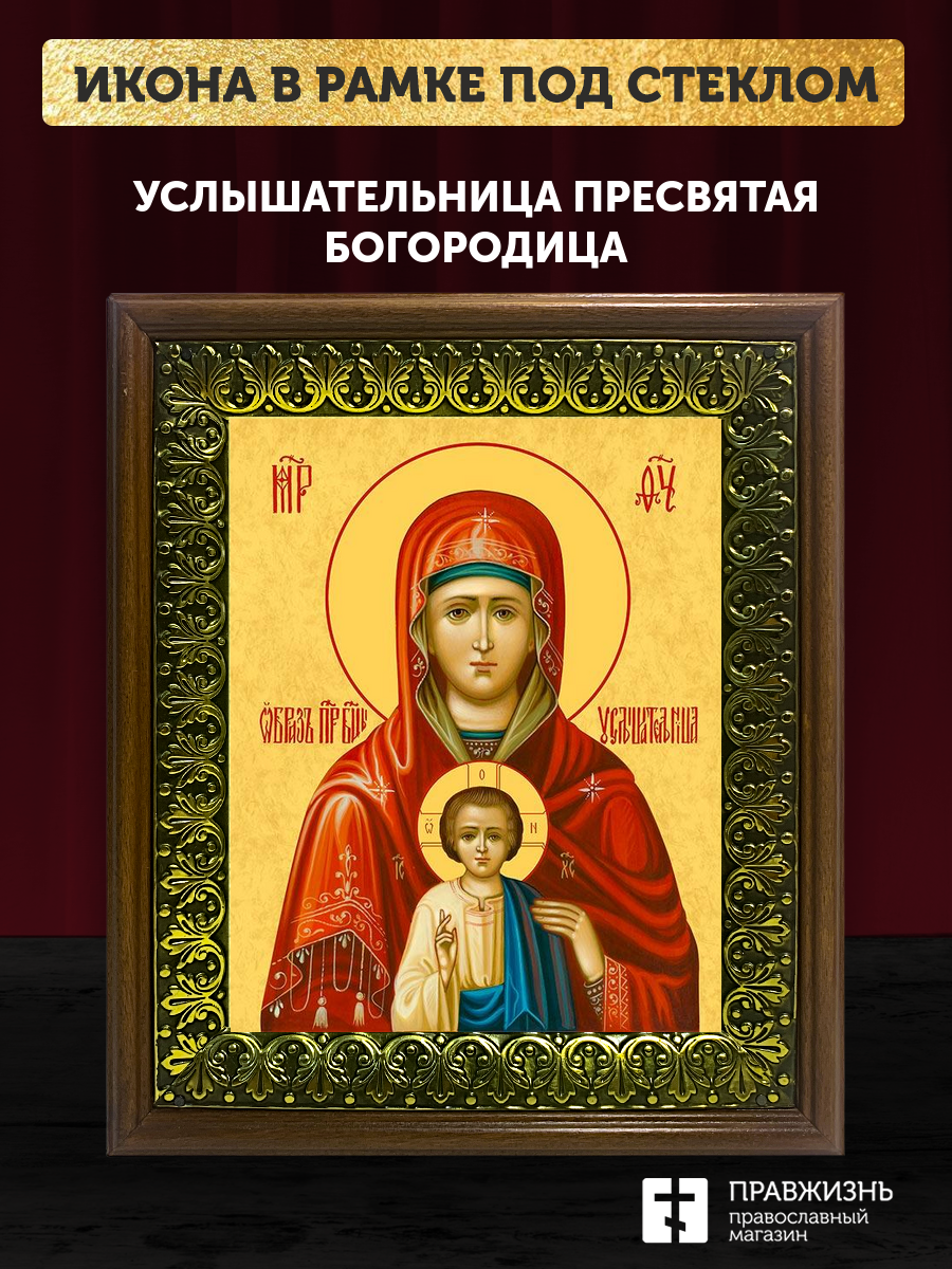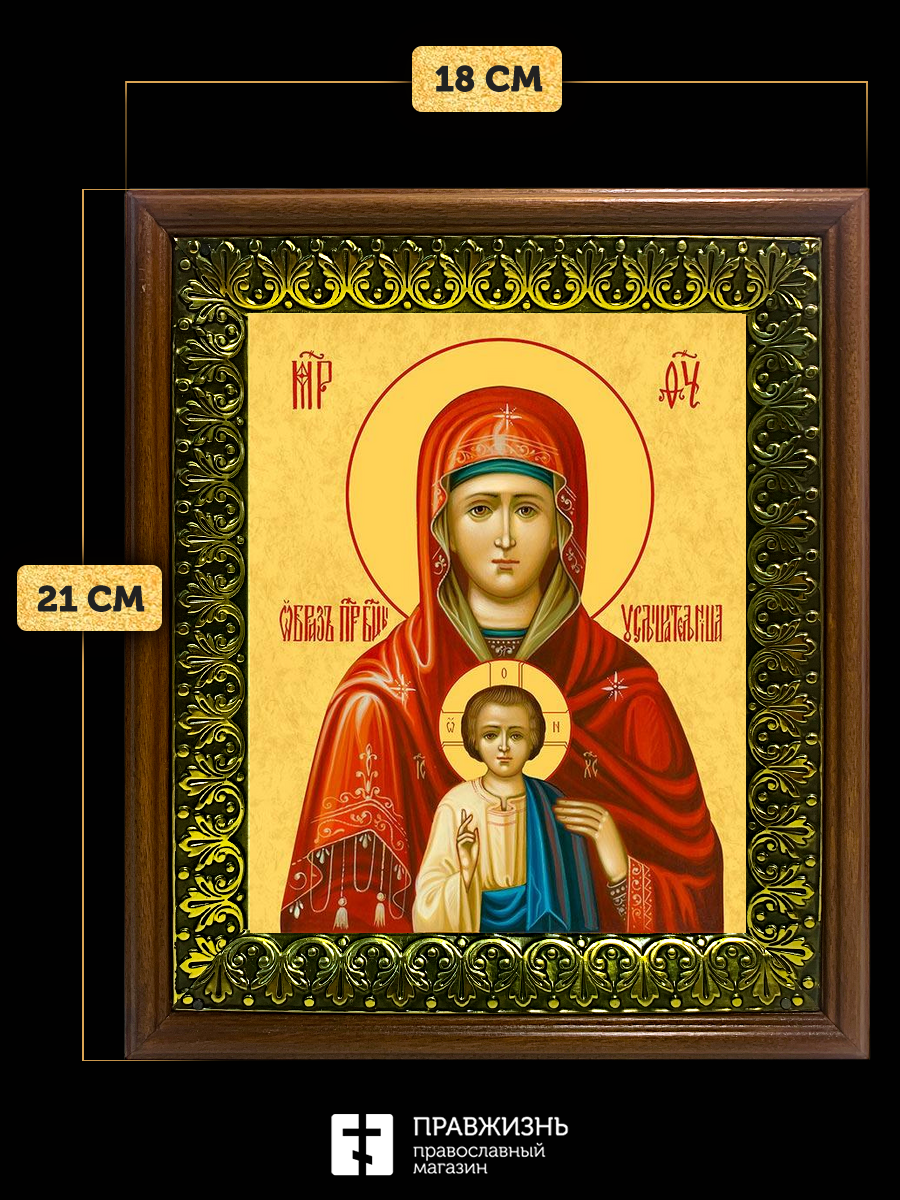 Икона Божией Матери Услышательница, деревянная рамка с басмой и стеклом 18х21х2,5 см 1241