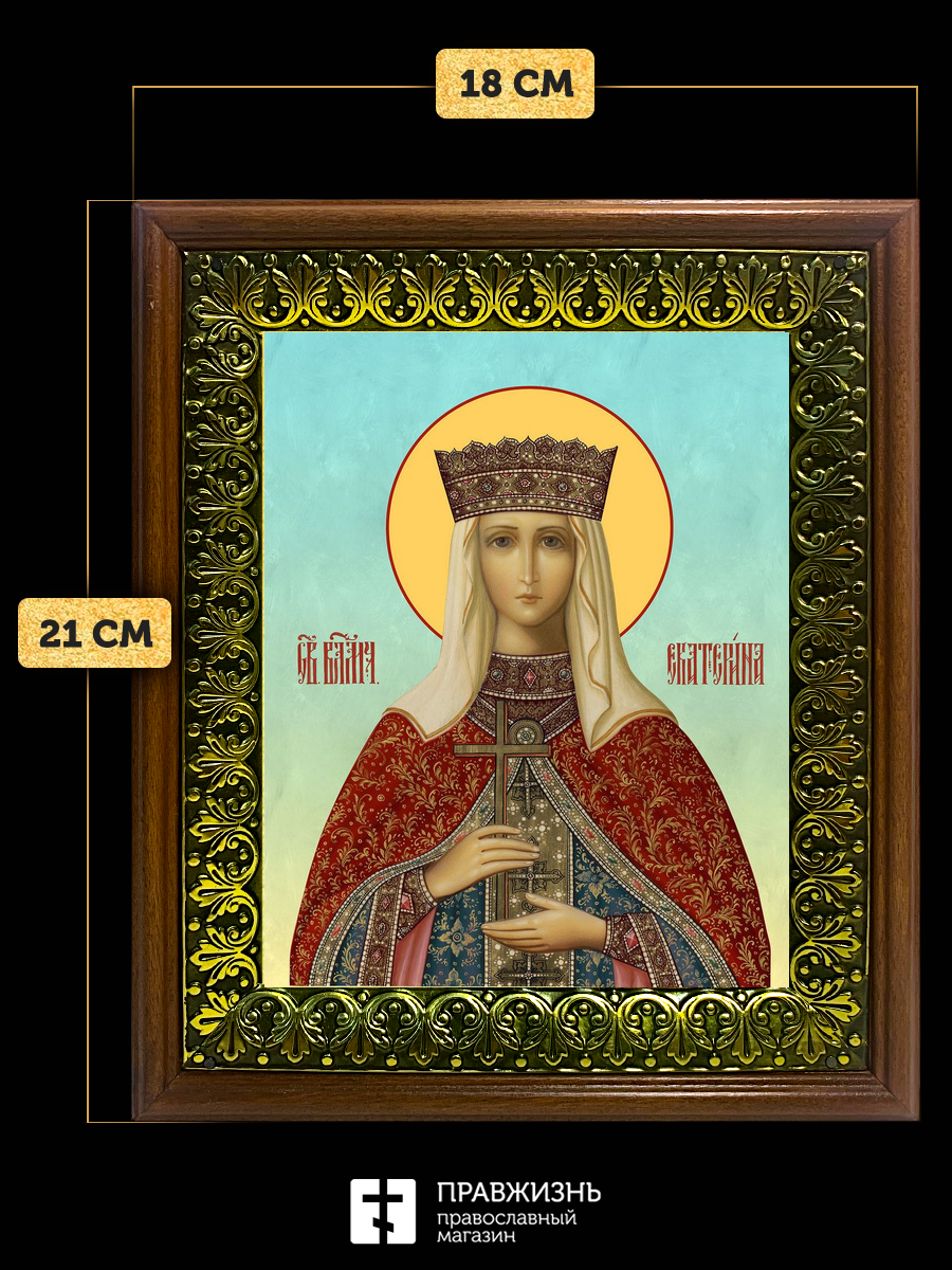 Икона Екатерина Александрийская великомученица, деревянная рамка с басмой и стеклом 18х21х2,5 см 070