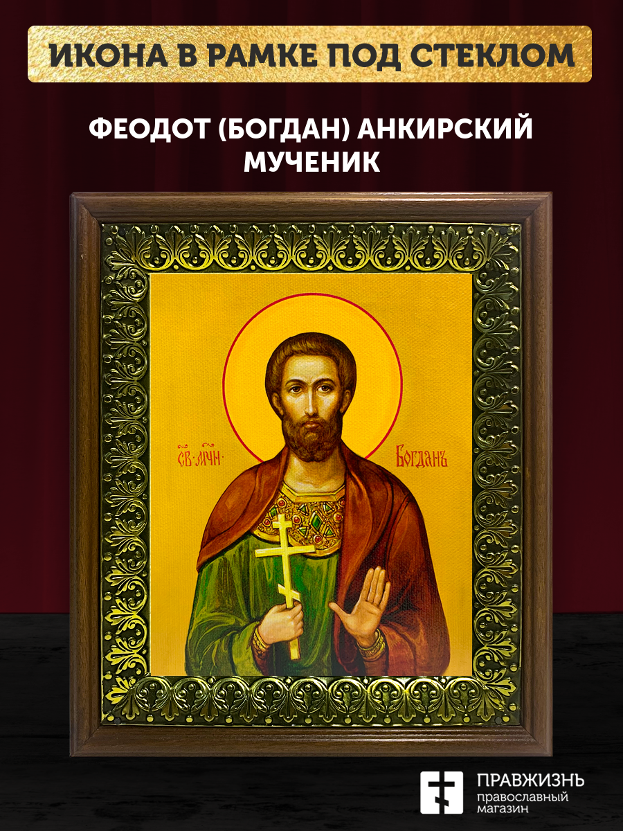 Икона Феодот Богдан Анкирский мученик, деревянная рамка с басмой и стеклом 18х21х2,5 см 169