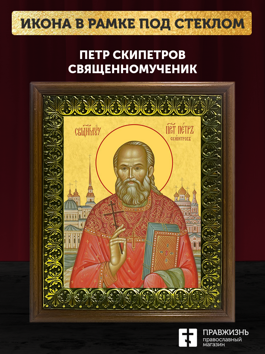Икона Петр Скипетров священномученик, деревянная рамка с басмой и стеклом 18х21х2,5 см 1249