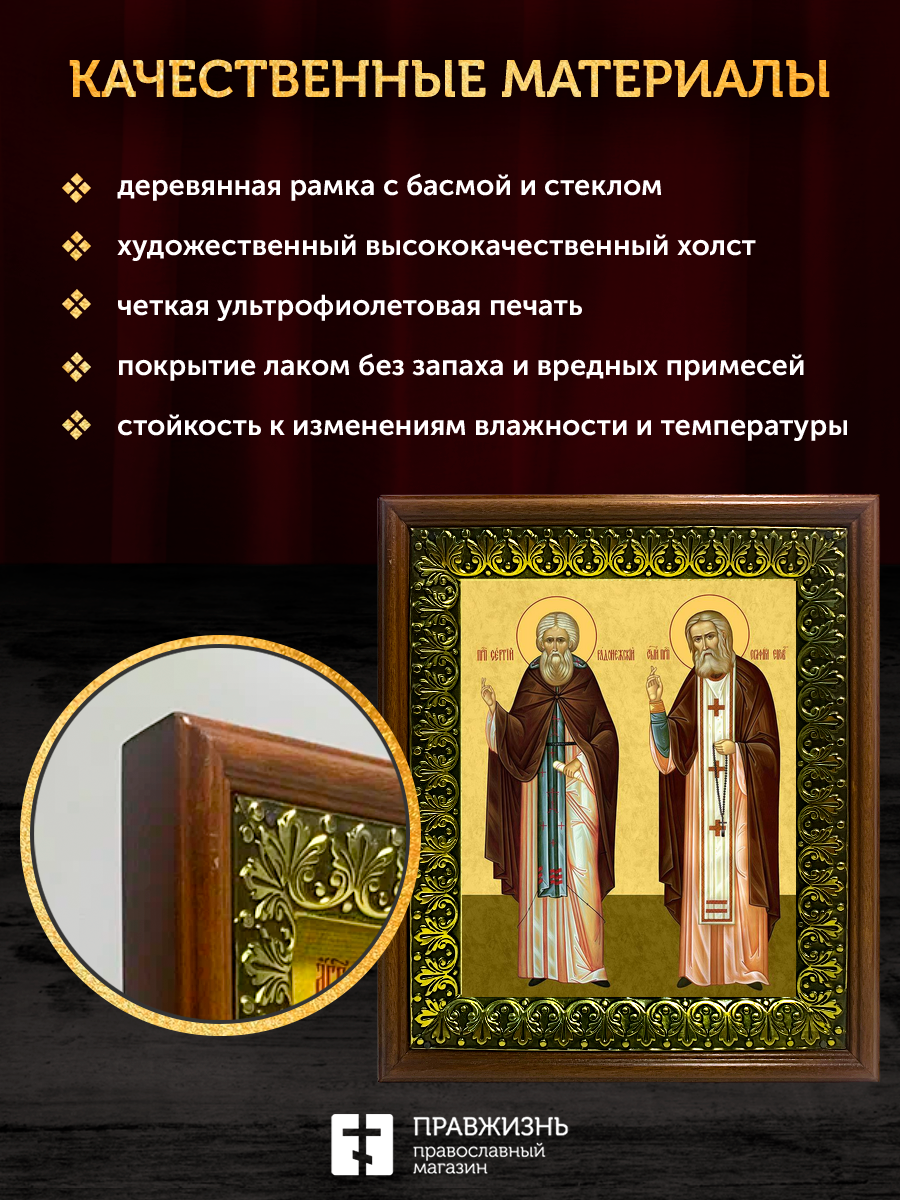 Икона Сергий Радонежский и Серафим Саровский, деревянная рамка с басмой и стеклом 18х21х2,5 см