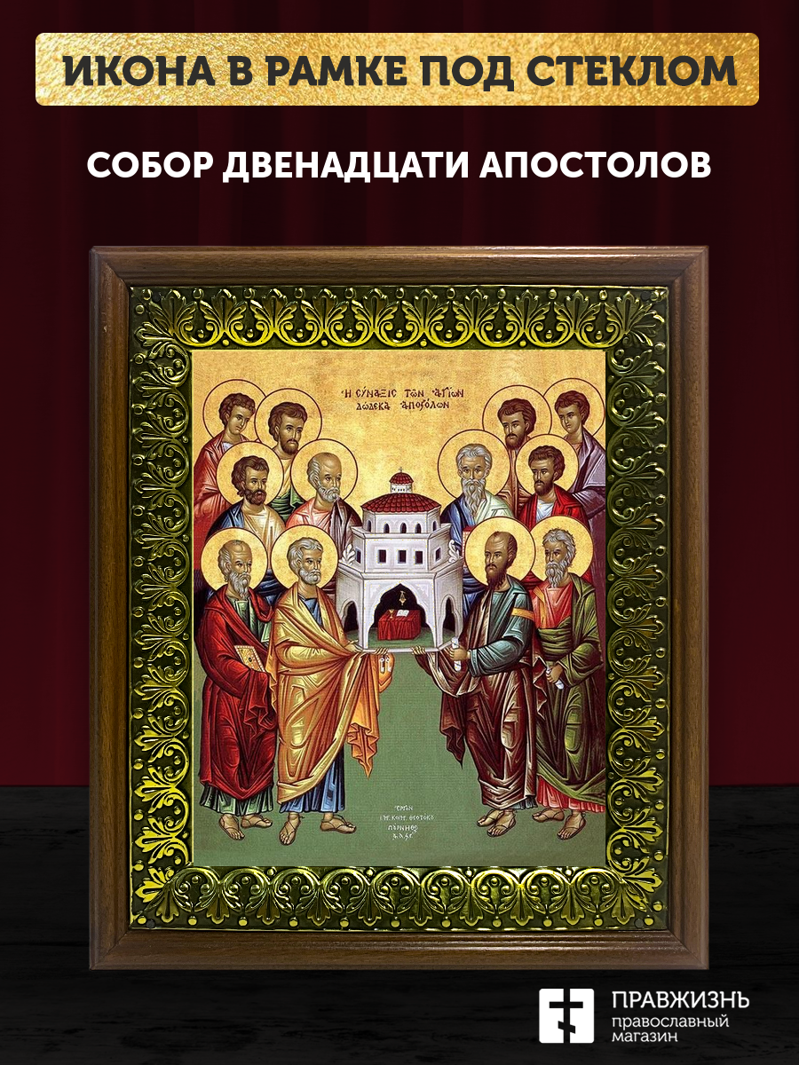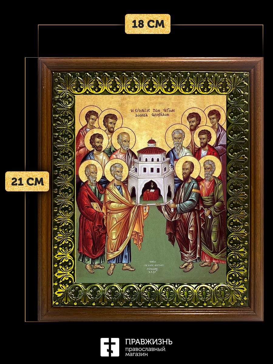 Икона собор двенадцати апостолов, деревянная рамка с басмой и стеклом 18х21х2,5 см