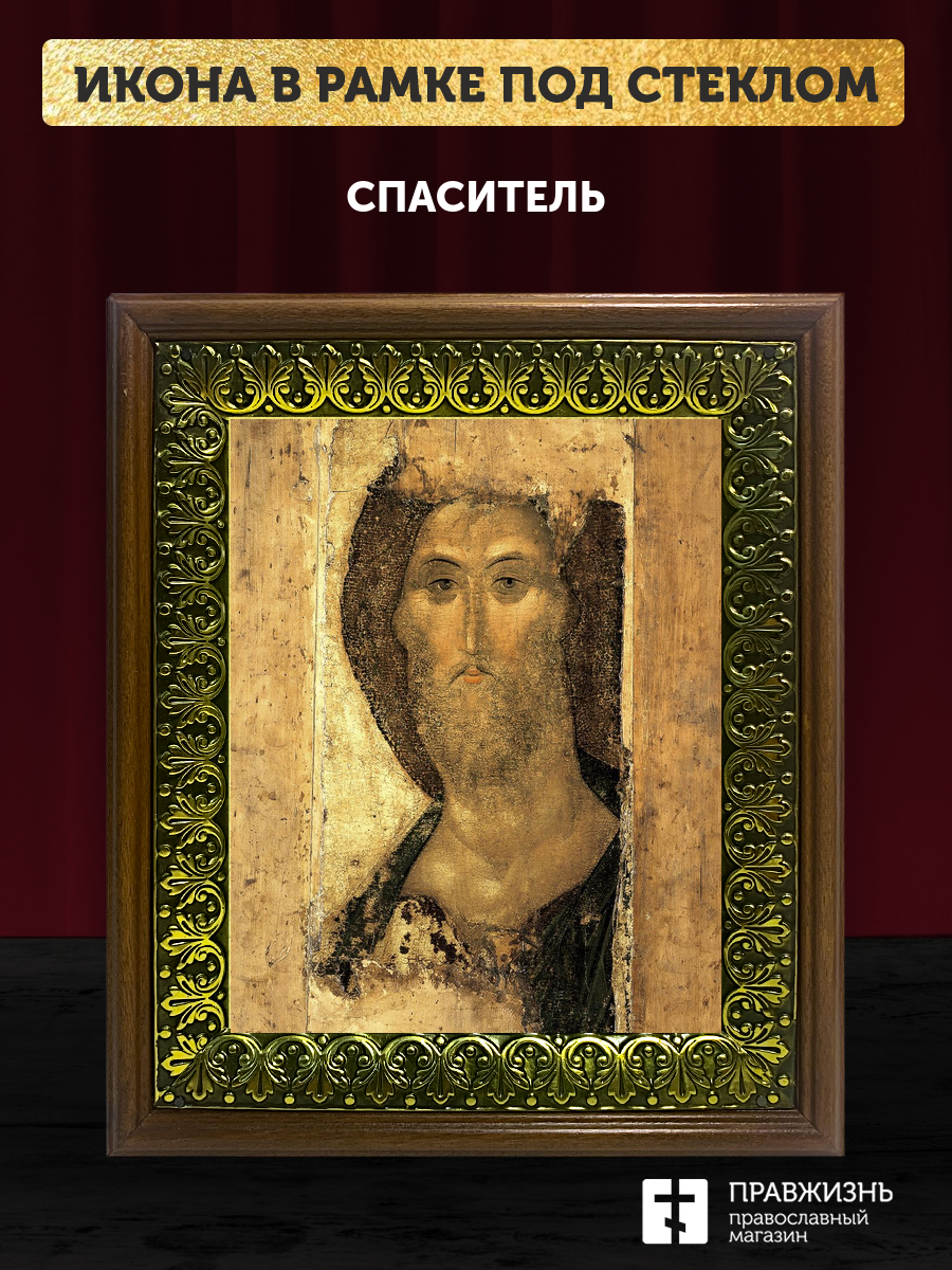 Икона Спаситель Господь Иисус Христос, деревянная рамка с басмой и стеклом 18х21х2,5 см 214