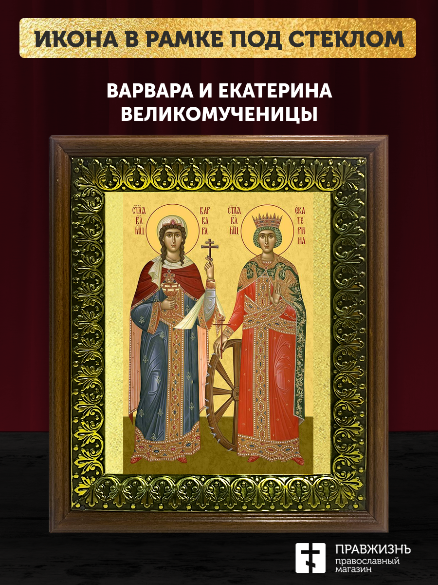 Икона Варвара и Екатерина великомученицы, деревянная рамка с басмой и стеклом 18х21х2,5 см 070 041