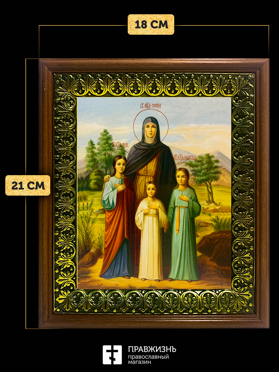 Икона Вера, Надежда, Любовь и мать их София мученицы, деревянная рамка с басмой и стеклом 18х21х2,5