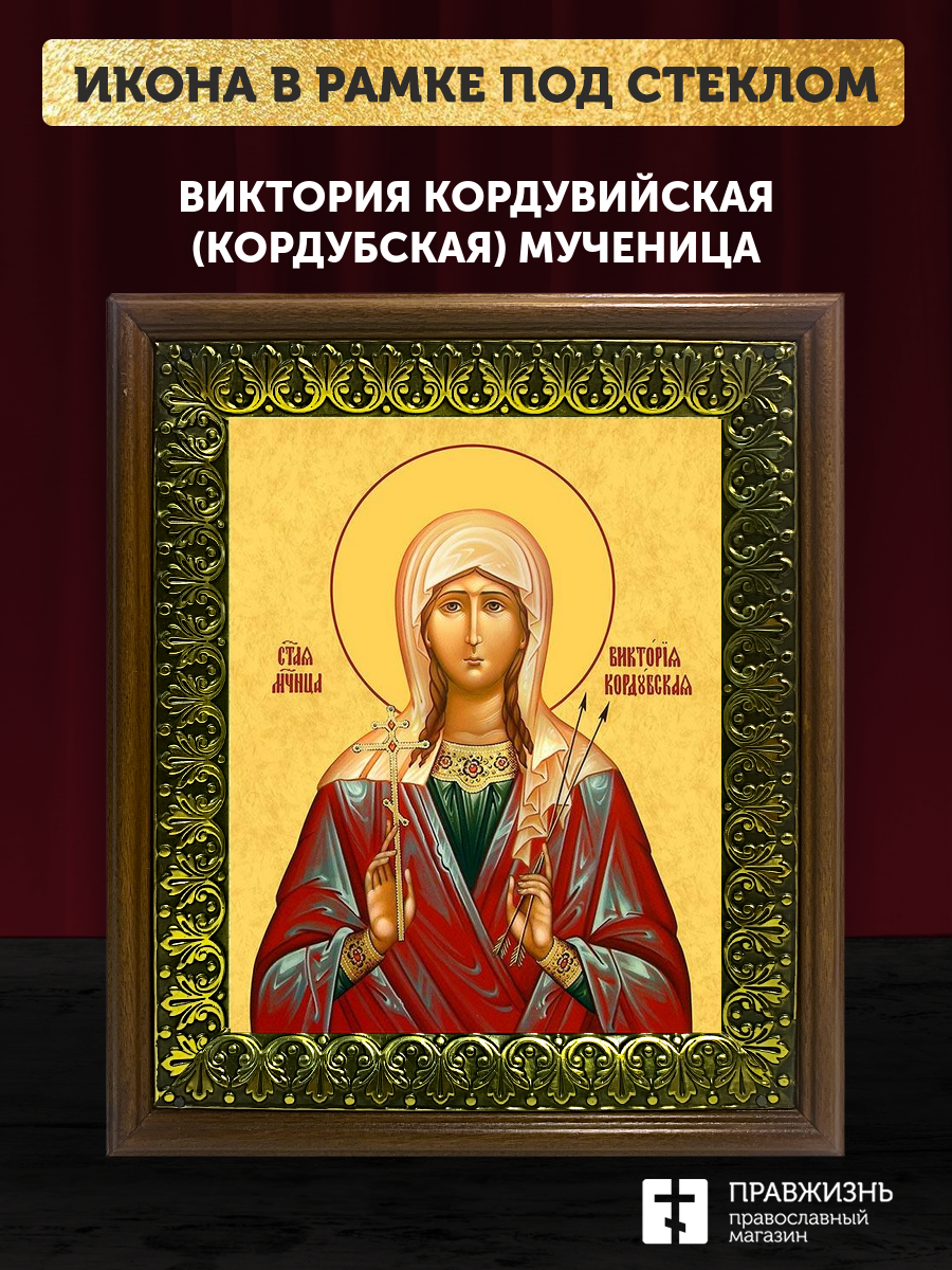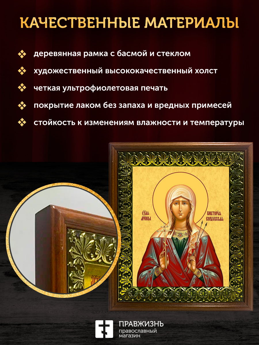 Икона Виктория Кордубская мученица, деревянная рамка с басмой и стеклом 18х21х2,5 см 310
