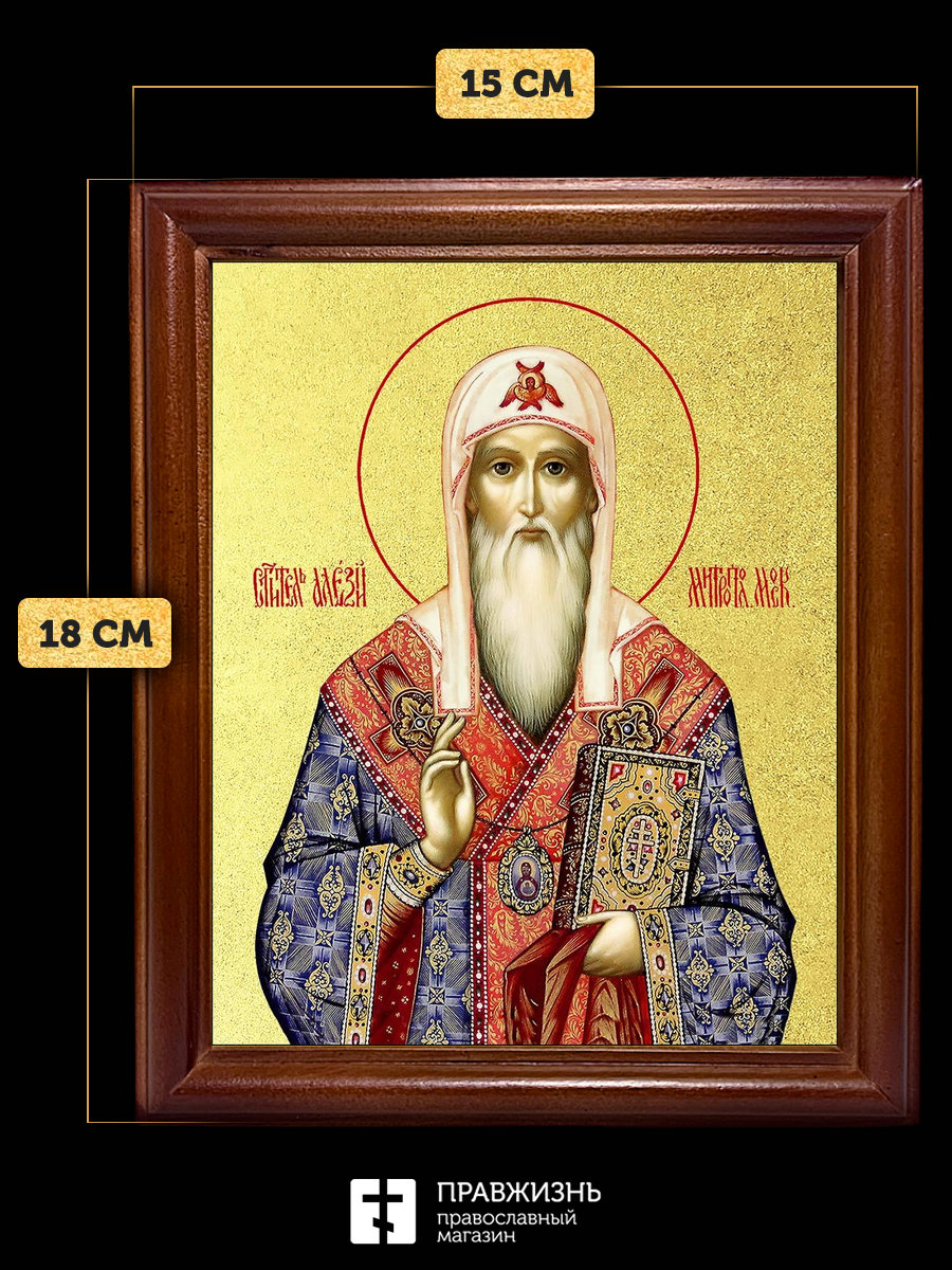 Икона Алексий митрополит Московский с золочением, деревянная рамка со стеклом 15х18х2 см 201
