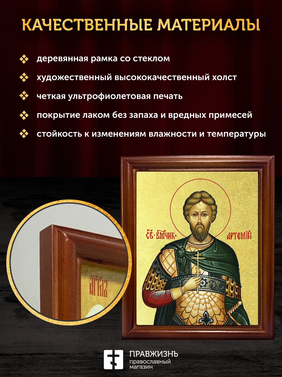 Икона Артемий великомученик с золочением, деревянная рамка со стеклом 15х18х2 см 349