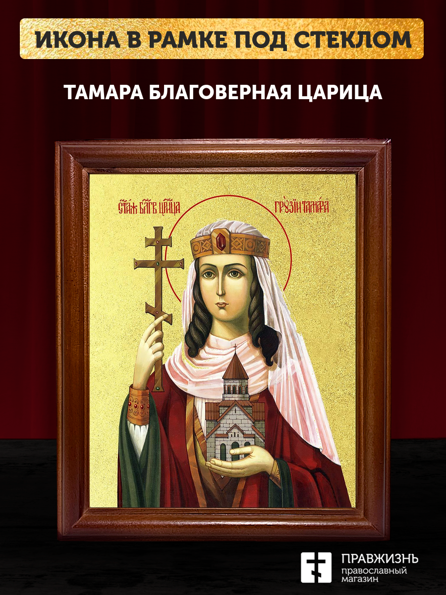 Икона Тамара благоверная царица с золочением, деревянная рамка со стеклом 15х18х2 см 136