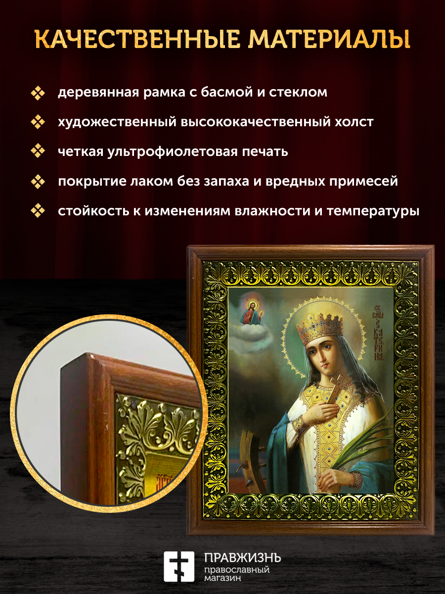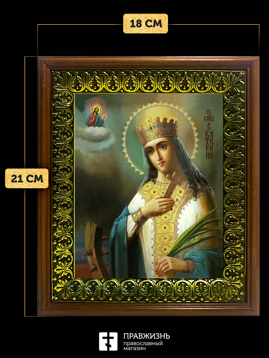 Икона Екатерина великомученица с золочением, деревянная рамка с басмой и стеклом 18х21х2,5 см 070