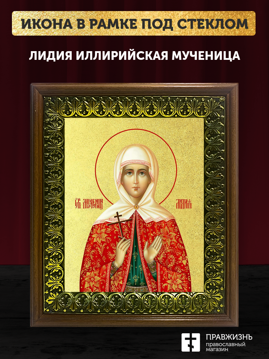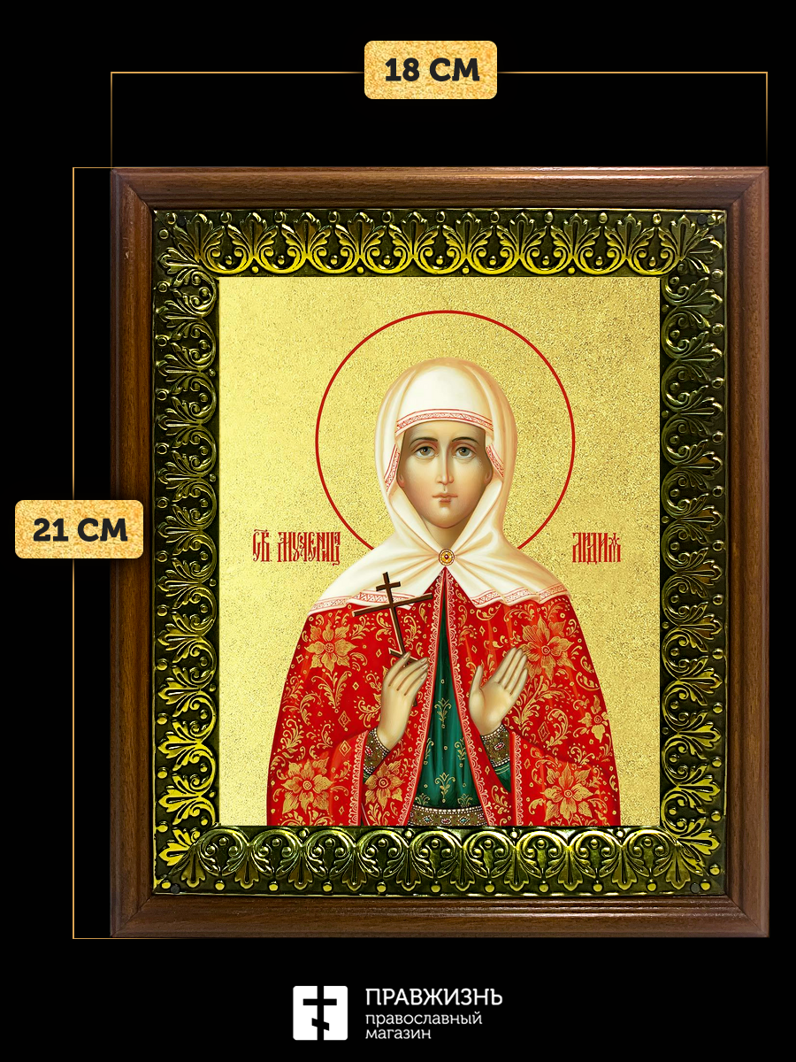 Икона Лидия Иллирийская мученица с золочением, деревянная рамка с басмой и стеклом 18х21х2,5 см 092