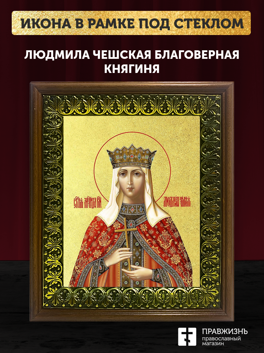 Икона Людмила Чешская благоверная княгиня с золочением, деревянная рамка с басмой и стеклом 18х21х2,