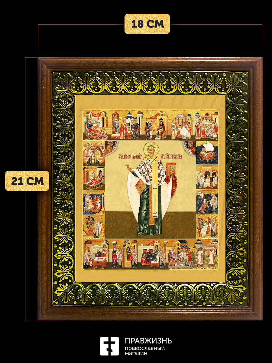 Икона Николай Чудотворец святитель с золочением, деревянная рамка с басмой и стеклом 18х21х2,5 см 11
