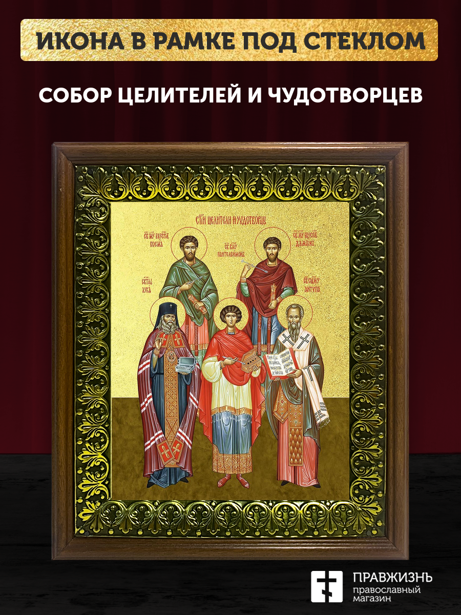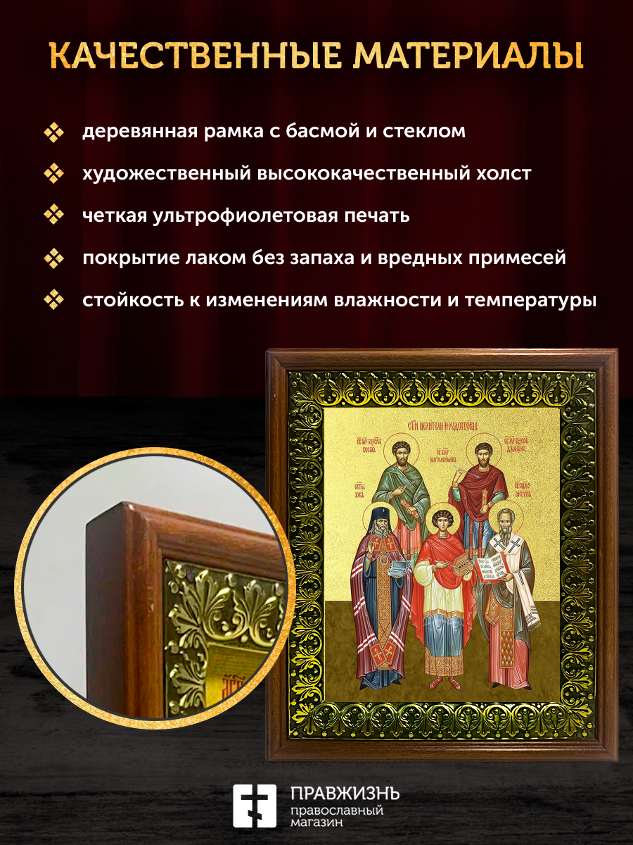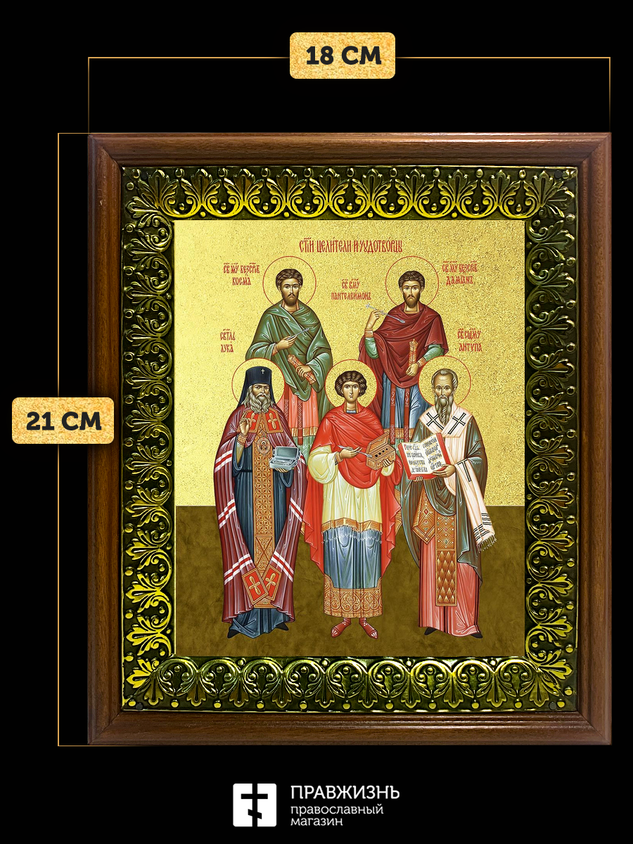 Икона собор целителей и чудотворцев с золочением, деревянная рамка с басмой и стеклом 18х21х2,5 см 1