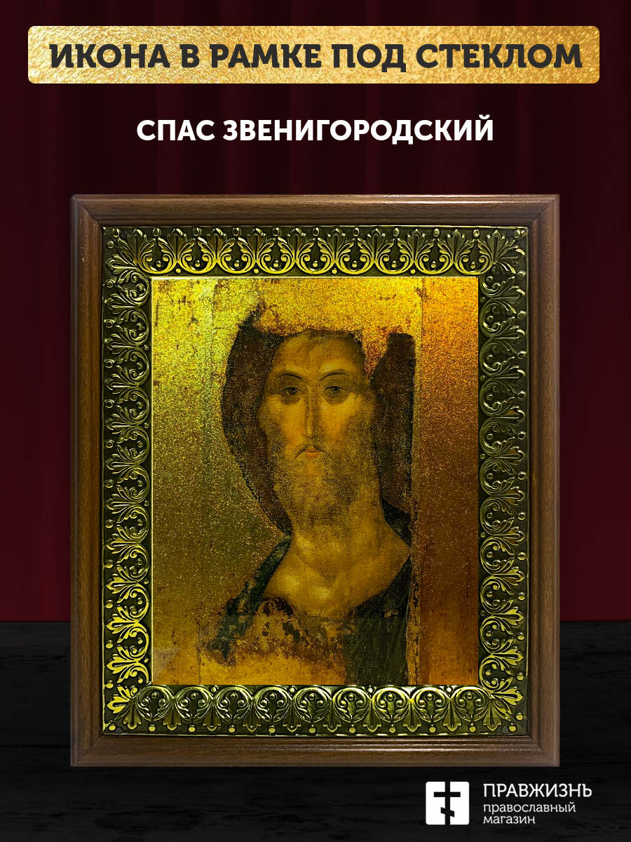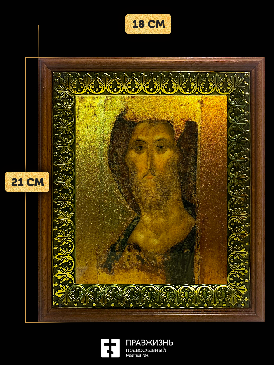 Икона Спас Звенигородский с золочением, деревянная рамка с басмой и стеклом 18х21х2,5 см 214