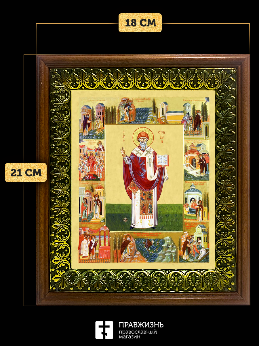Икона Спиридон Тримифунтский святитель с золочением, деревянная рамка с басмой и стеклом 18х21х2,5 с