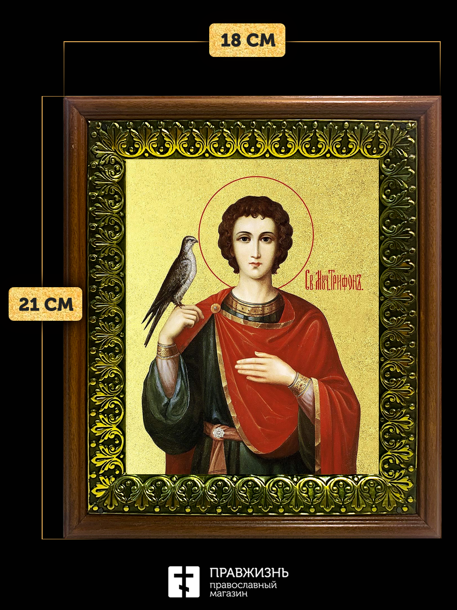 Икона Трифон мученик с золочением, деревянная рамка с басмой и стеклом 18х21х2,5 см 140