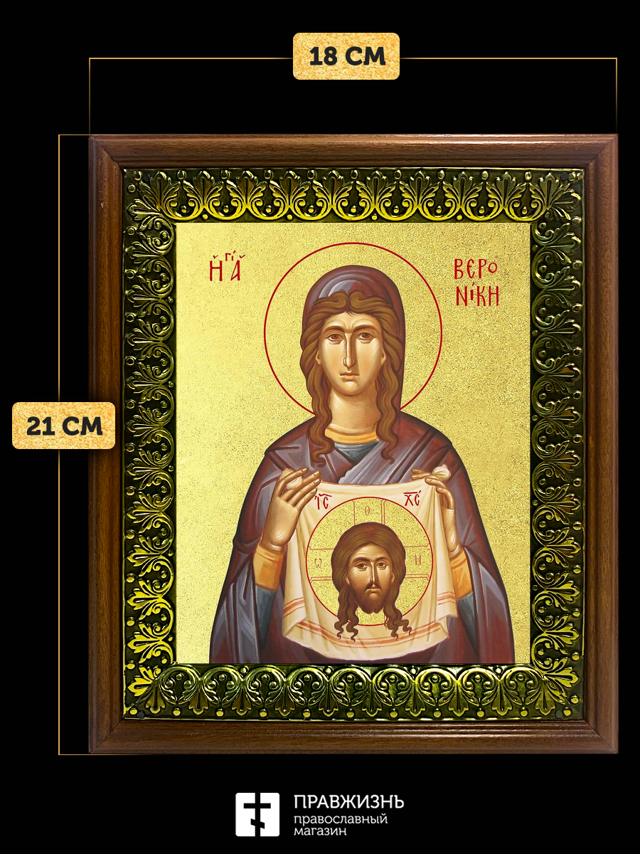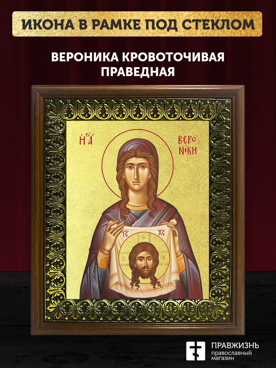 Икона Вероника Кровоточивая праведная с золочением, деревянная рамка с басмой и стеклом 18х21х2,5 см