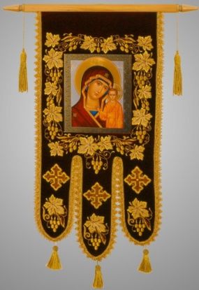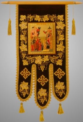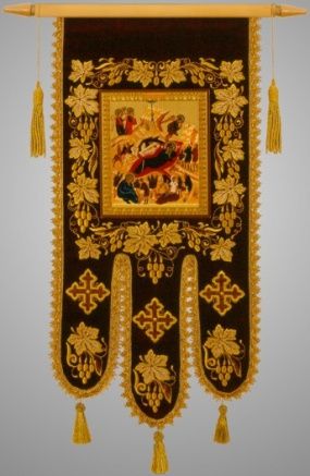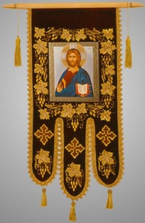 Хоругви с вышивкой гладью+аппликация - представляют из себя традиционный церковно-православный атрибут, который принимает участие в торжественном шествии. Православно-церковные хоругви характеризуются богатым, божественным и эстетическим внешним видом. В них спрятана глубокая православная философия, которая включает в себя всю историю христианства. Православные хоругви способны создать в Храме особую церемониальную и величественную обстановку, в которой можно отступиться от бытовых проблем. Изысканные церковные хоругви можно считать элементом храмового убранства поэтому они также помогают единению православного с Богом.
