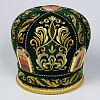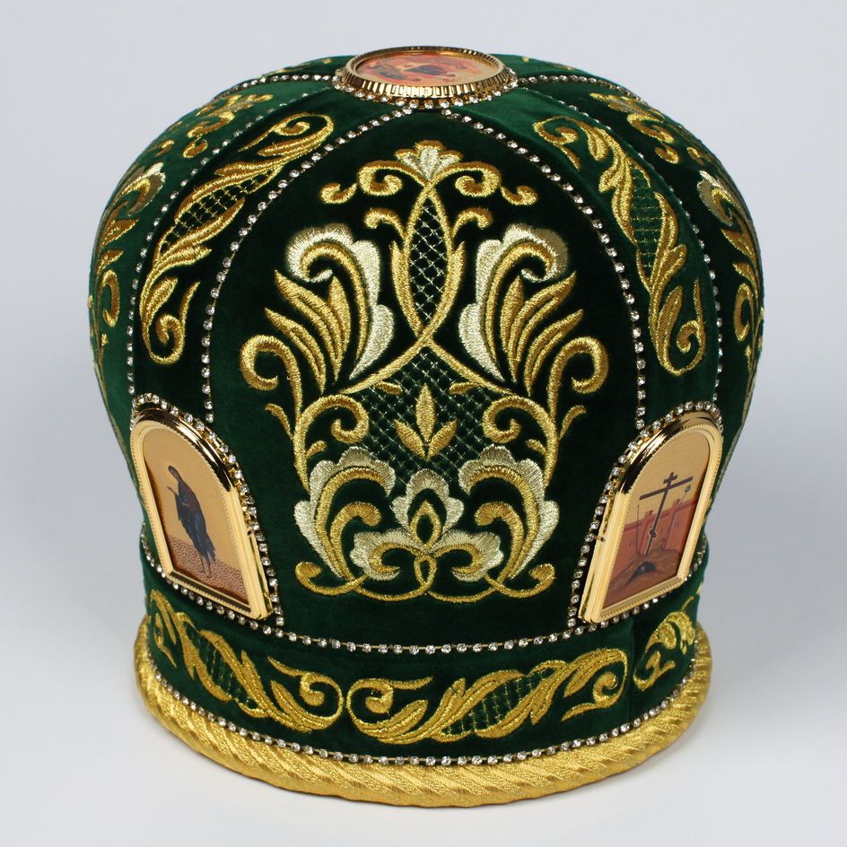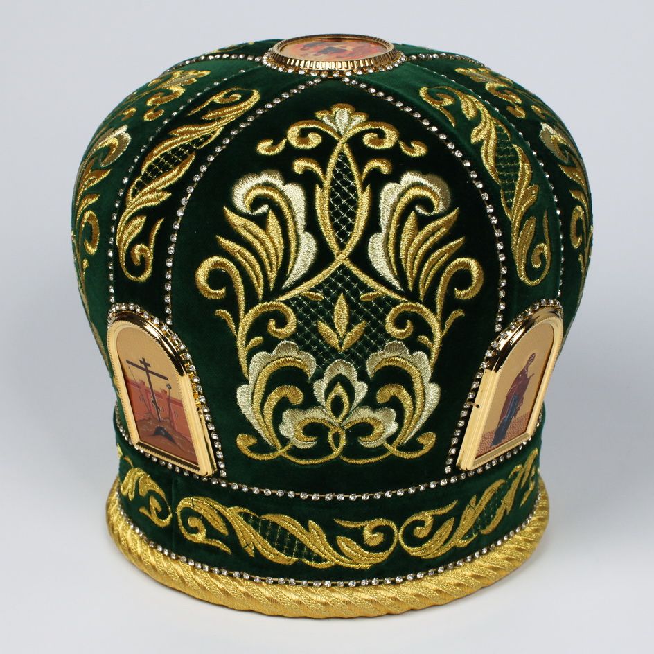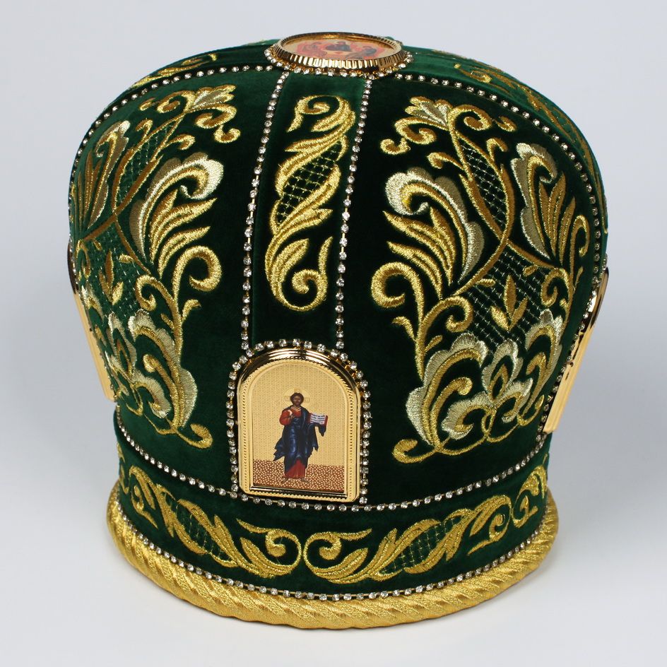 Упаковка: Визикроновый футляр зеленая митра по акции размер 59 Митра выполнена из натурального немецкого бархата. Состав материала: 100% хлопок (Германия). Отделочные элементы: автоматическая вышивка, стразовые дорожки, фоторамки. Доступны к исполнению все размеры. По Вашему желанию мы можем поменять иконы на митре, поставить крест, заменить материал.