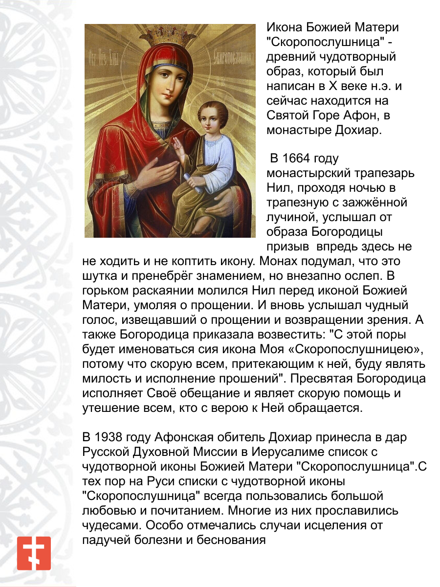 Считается, что икона помогает в учебе и работе, способствует успеху в начинаниях и защищает от бед и напастей. К "Скоропослушнице" обращаются за советом и наставлением, когда не знают, как поступить. Молитва перед этой иконой дарует утешение и надежду, укрепляет веру и помогает преодолеть любые трудности.