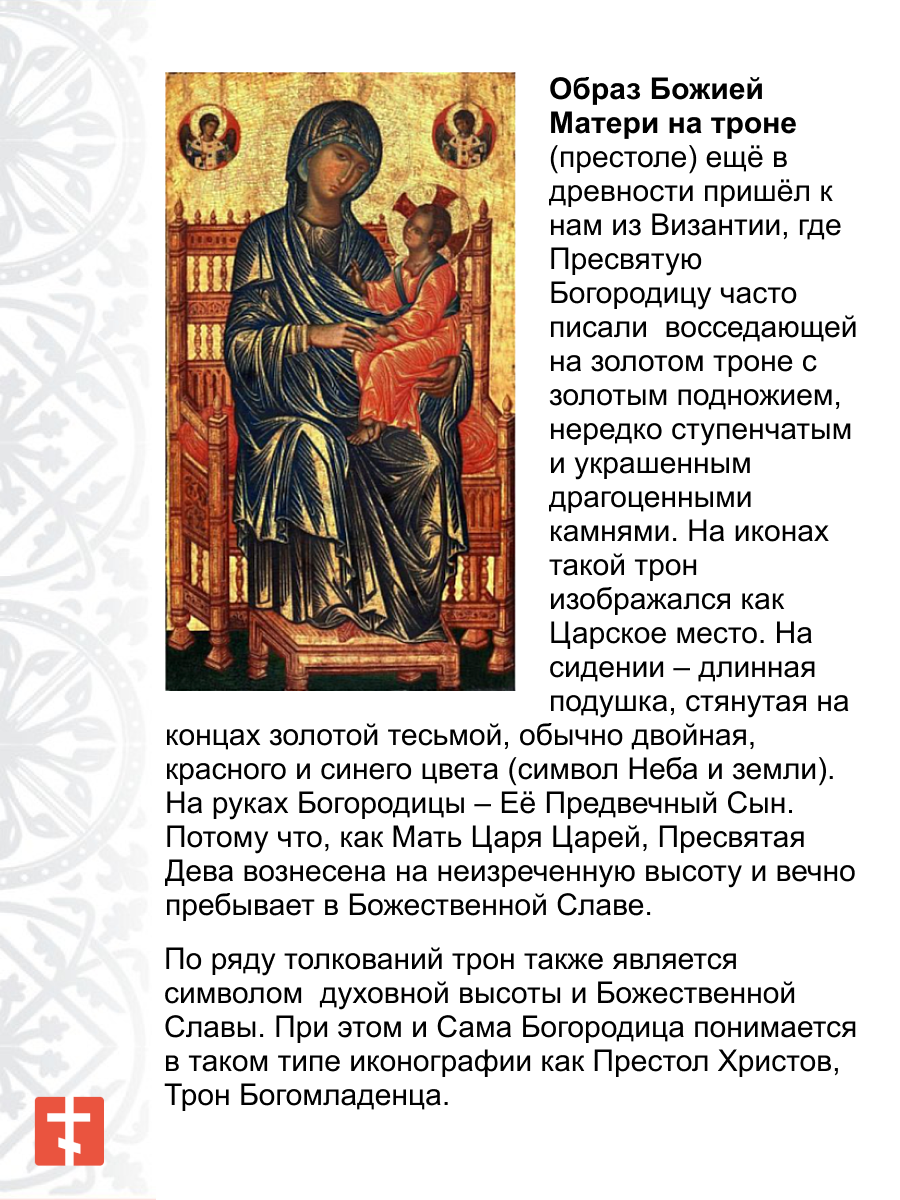 Младенец Иисус, обычно изображенный на коленях Богоматери, благословляет мир, являясь центром и источником духовной силы. Трон, как символ власти, указывает на роль Богородицы как Заступницы и Покровительницы человечества.