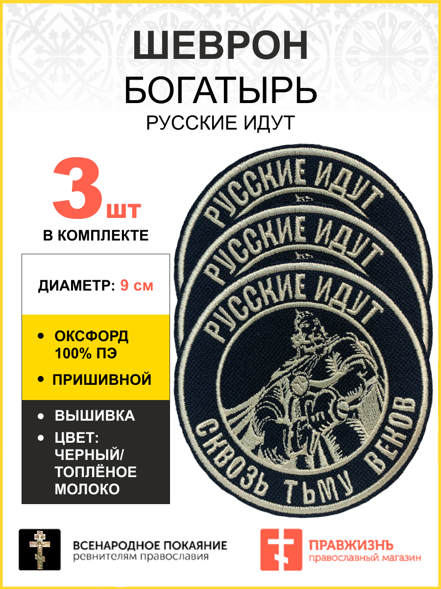 Набор шевронов Богатырь Русские идут пришивной оксфорд цвет черный нитка топлёное молоко диаметр 9 с