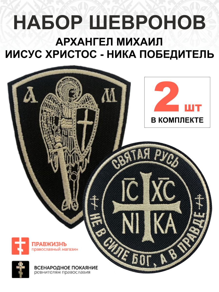 Набор шевронов НИКА Не в силе Бог диаметр 9 см+АРХАНГЕЛ МИХАИЛ высота 11 см, на липучке, черный/топл