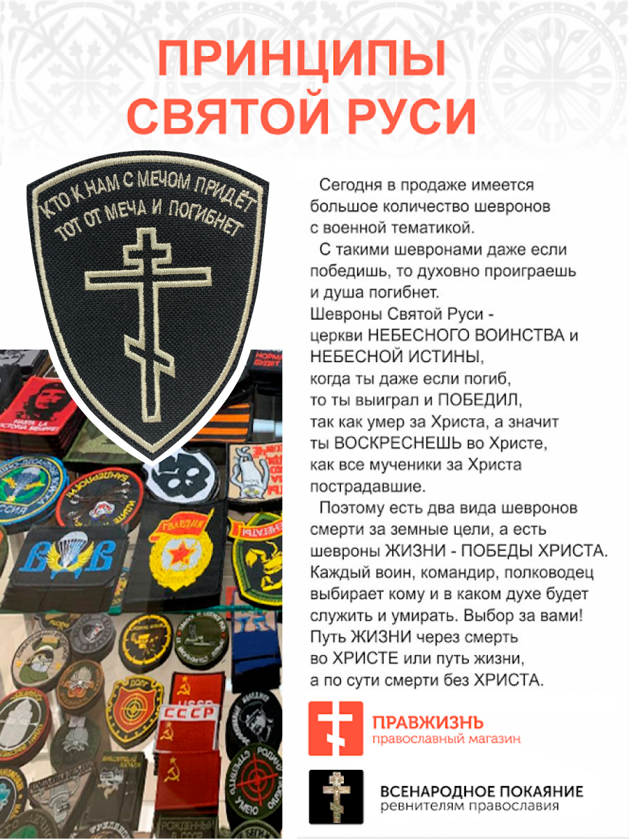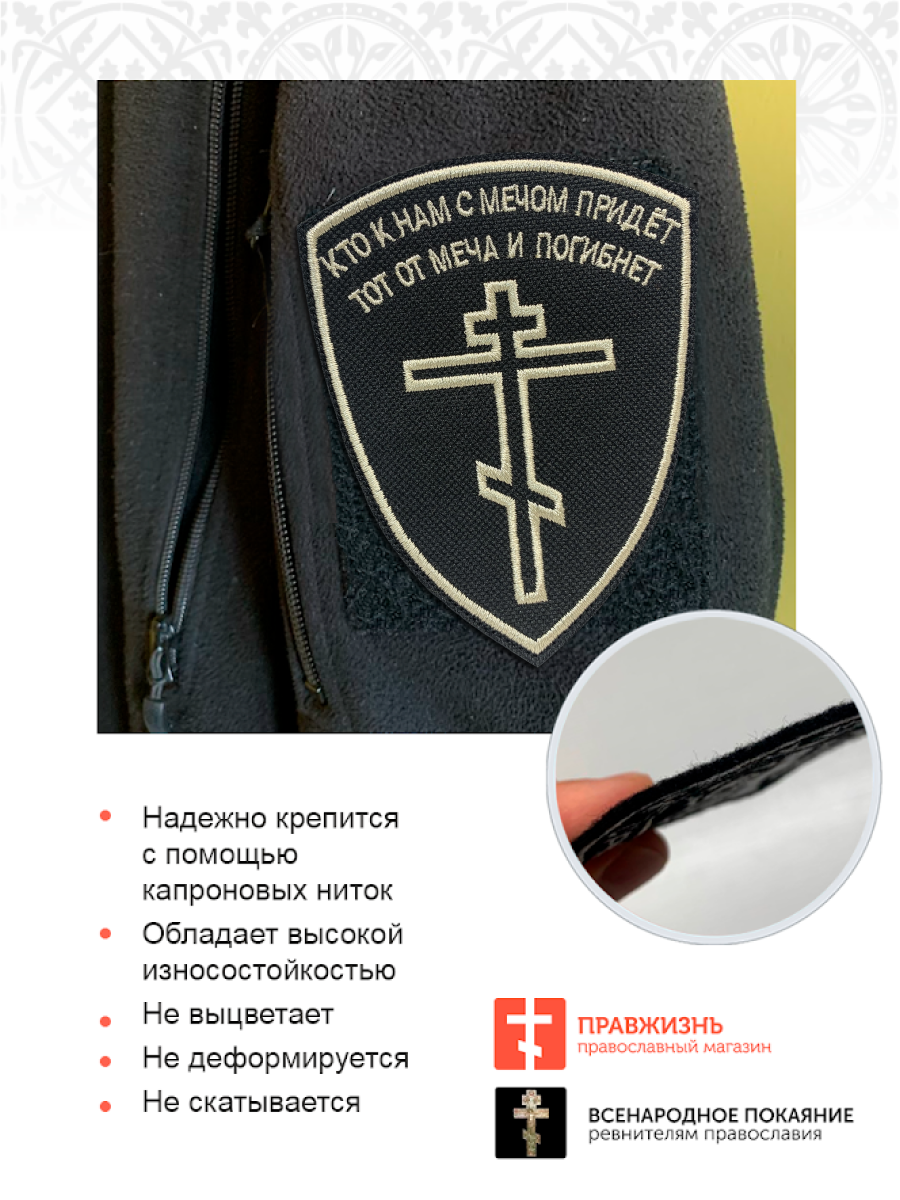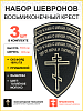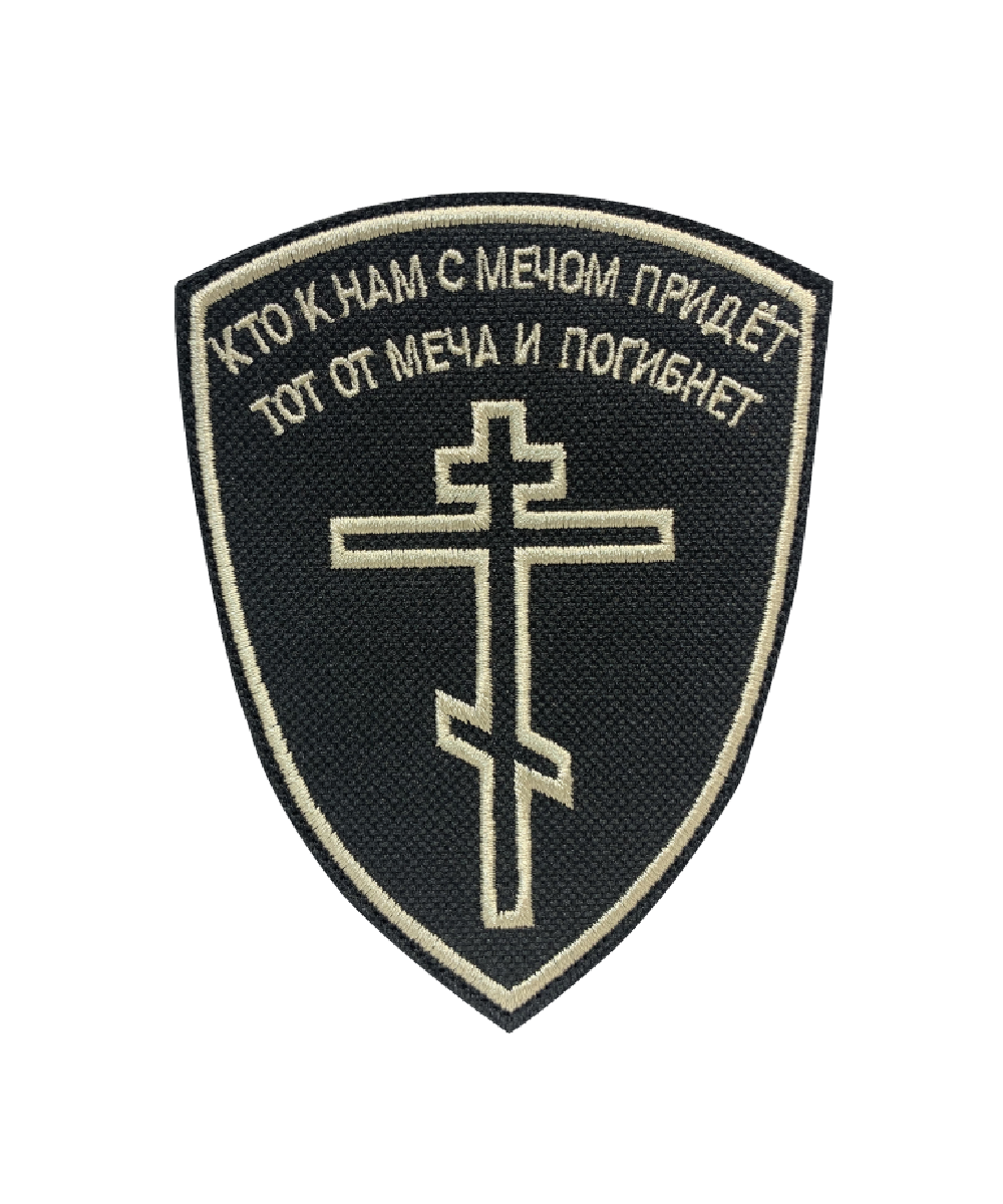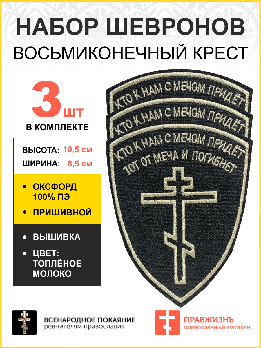 Набор шевронов Восьмиконечный Крест Кто с мечом к нам придет пришивной 8,5х10,5 см, материал оксфорд, черный, нитка топленое молоко 3 шт