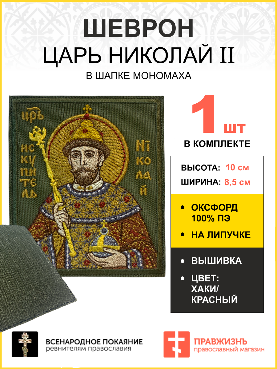 Шеврон Царь Николай в шапке Мономаха в красном на хаки на липучке оксфорд 8,5х10 см 1 шт