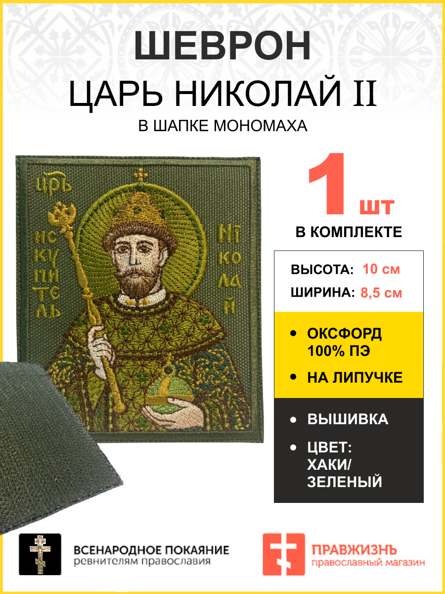 Шеврон Царь Николай в шапке Мономаха в зеленом на хаки на липучке оксфорд 8,5х10 см 1 шт