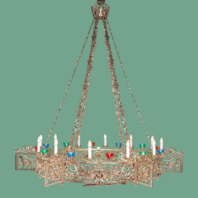 Артикул: Хорос-012/6г Материал: Латунь - 24 свечи Вес: 98кг Диаметр: 1510мм - кольцо, 2100мм - по кронштейны Высота: 2200мм Описание хороса Разрабатывая модель Хороса - Углич, наш художник вдохновлялся работами старо-русских мастеров, применяя только ручную работу и традиционный для церковной утвари материал латунь. Нам удалось создать уникальный Хорос. Его внешний вид говорит о тысячелетней истории православия в нашей стране и глубокой традиции в украшении церквей и храмов. Хорос украшен лампадами, в которых установлены светодиоды, что даёт ощущение настоящей свечи. Количество света-точек, диаметр и высота могут быть изменены по вашему желанию.