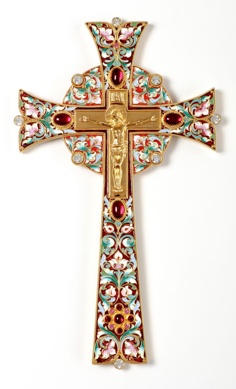 Крест напрестольный №17 литьевое распятие, филигрань, эмаль, лазерная гравировка, золочение