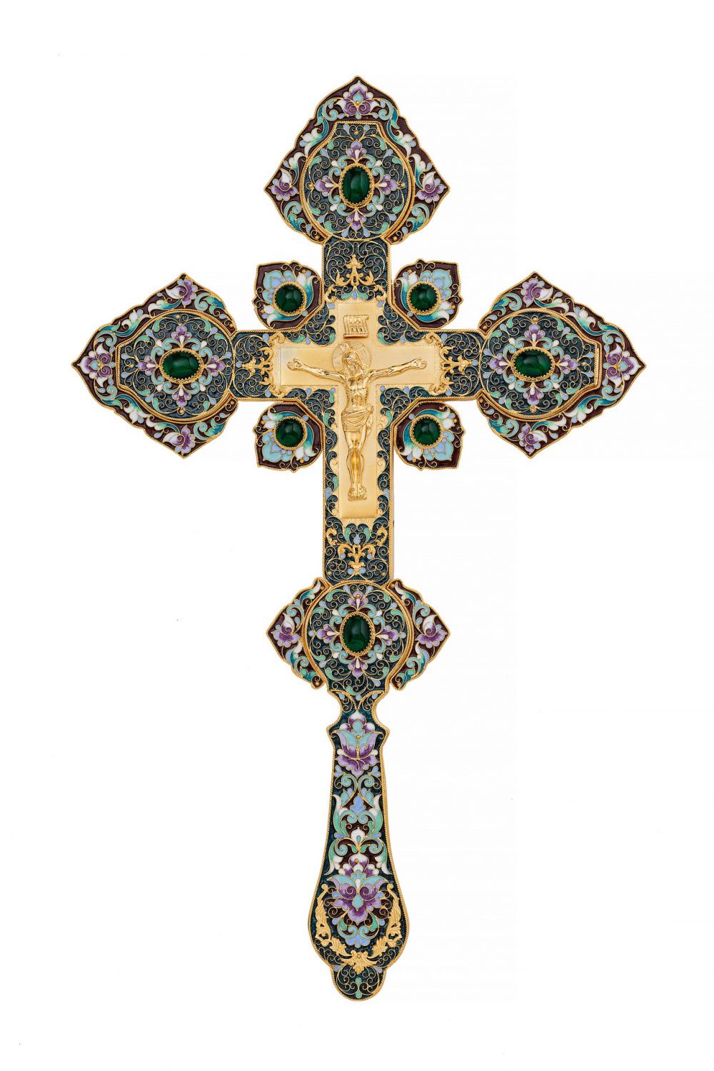 Крест напрестольный №4 литьевое распятие, филигрань, эмаль, хим.гравировка / золочение